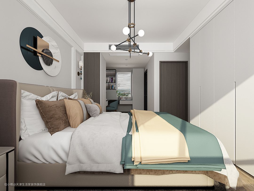 整体色调采用浅粉加浅蓝,床头背景分色处理的手法既有划分区域又使空间色彩点缀对,使空间增添活泼的气氛。