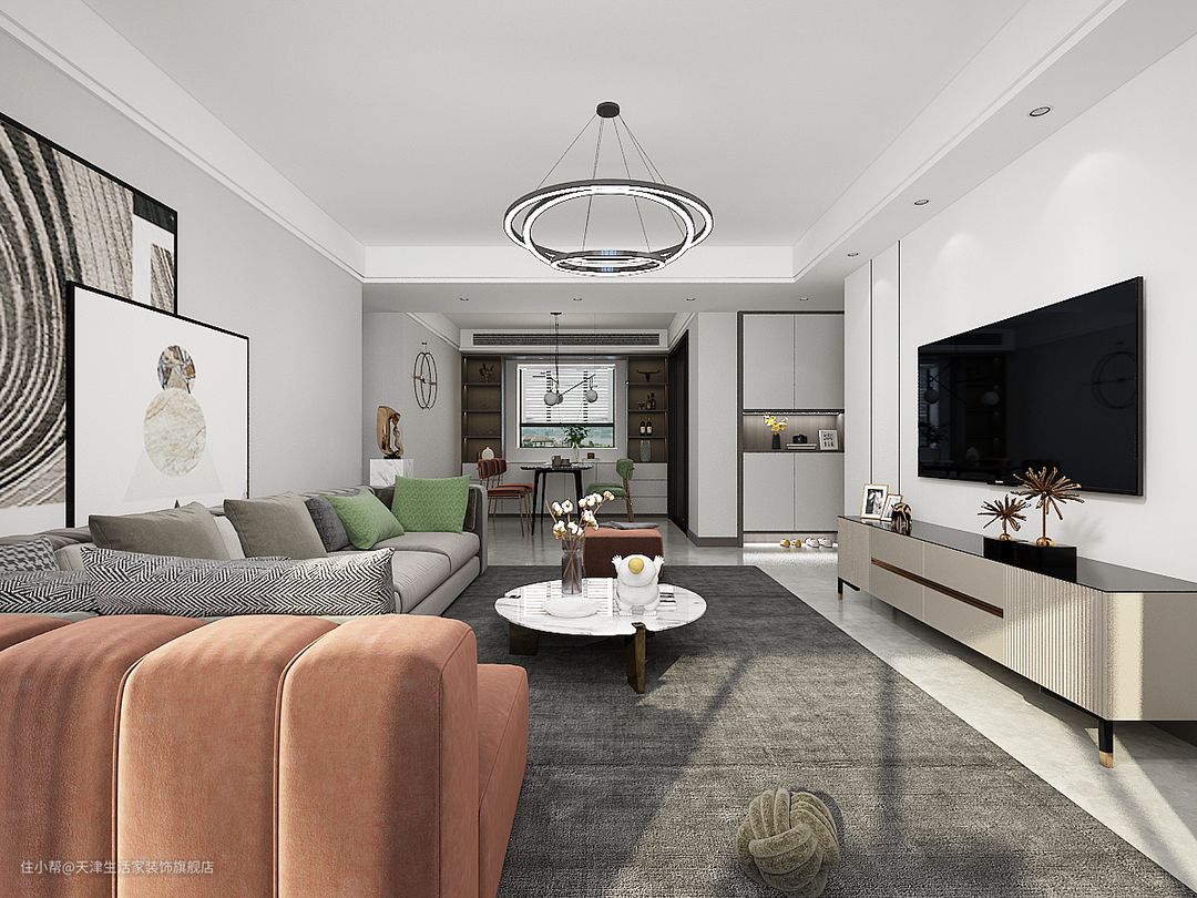 客厅整体设计元素基调淡雅,低调的设计来打造现代休闲式的舒适感,局部采用珊瑚金色和抹茶绿进行点缀,使空间素雅而不失单调。
