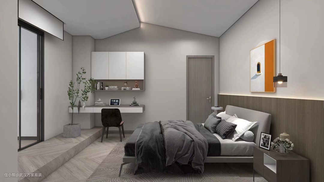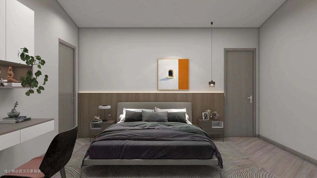 主卧因为三面都有门一面还有台阶,所以就只能居中靠墙放置,床后设计木饰面+灯带当做床头装饰。
