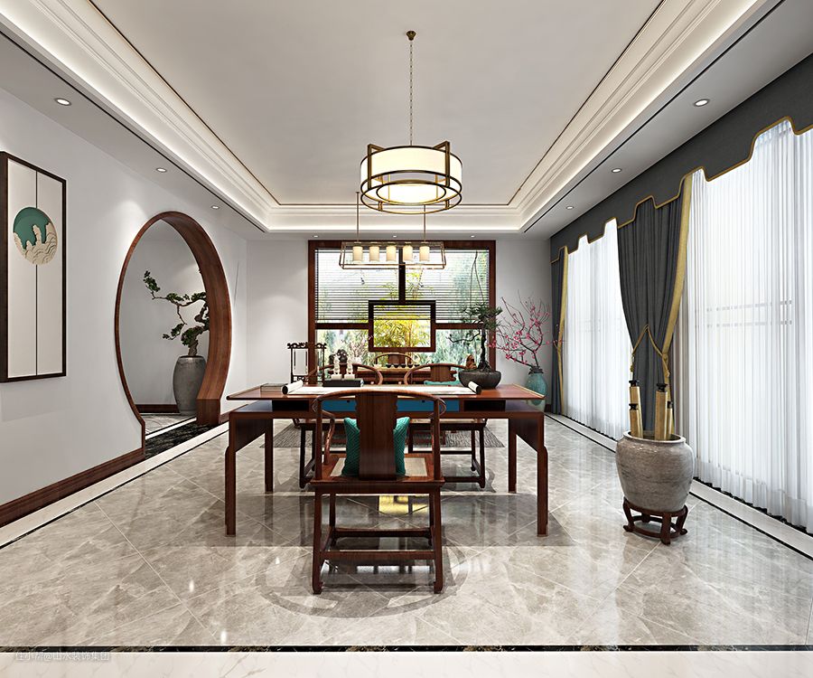 新中式风格的家居中,怎能没有一间书房呢?本案设置了两间书房,一间将书房和茶室融为一体,以月洞门形成开放式布局,大面积的落地窗引入充足的自然光,无论是接待友人还是独自品茗,均可满足。另一间书房面积略小,利用过道空间打造而成,可满足办公、阅读等需求。