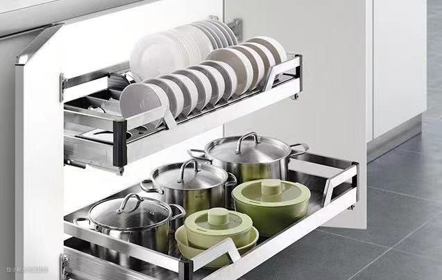橱柜底柜设置拉篮:平时可以将砧板、大油壶、调味瓶、储物罐等烹饪所用的物品放进去,还可以一边看着锅一边顺手拿起自己需要的调料罐,顺手很多。
