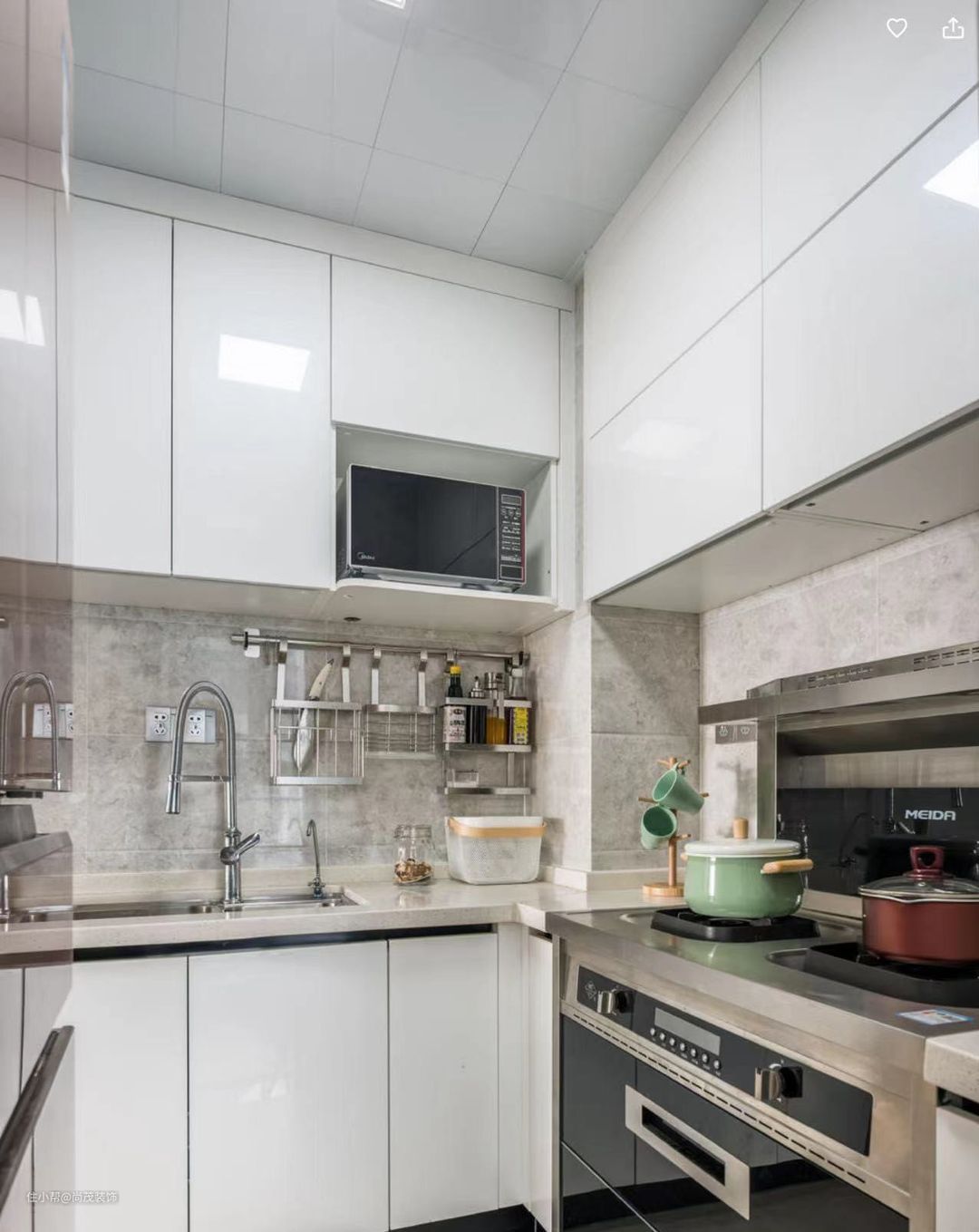 厨房面积小不等于空间小,您需要的是一双发掘空间的慧眼,简单来说,就是让空间的利用率最大化,把常用的物品摆放到触手可及的地方)(上下一臂以内),方便取用。