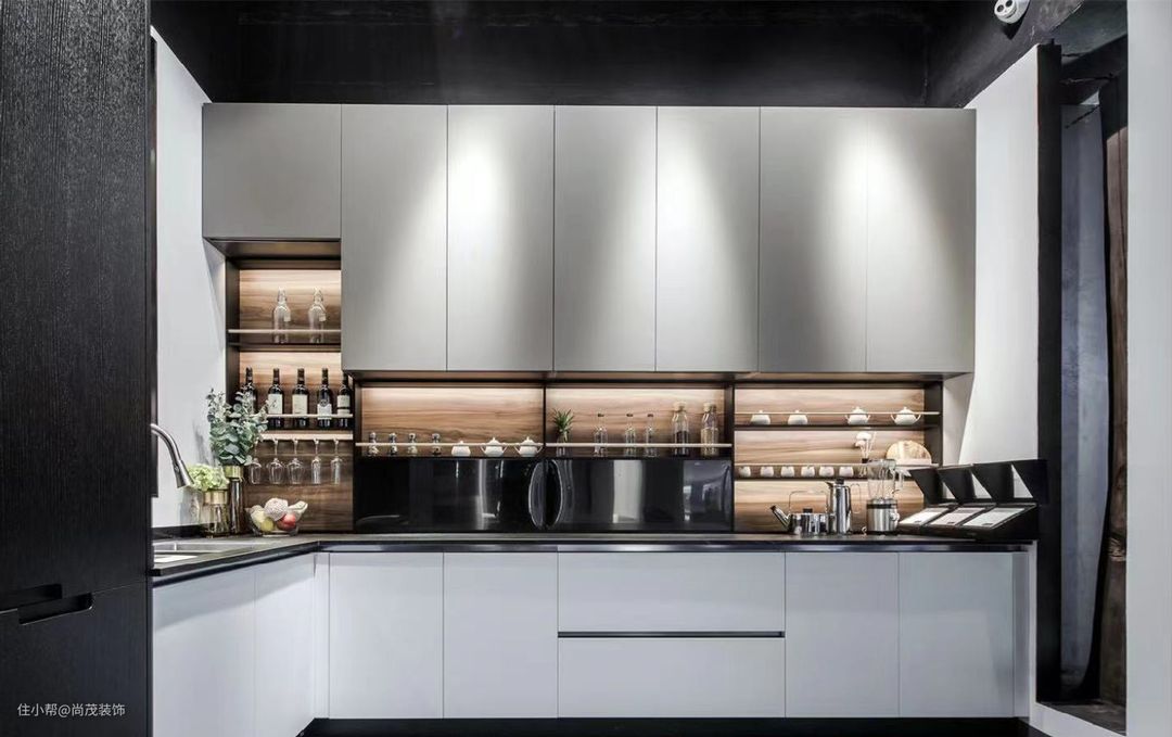 L型橱柜适合整体空间比较偏长型且面积较小的厨房,以墙角为中心双向展开设计,这样最能节省空间,厨房利用率最大化,整个空间布局更为灵活,整个烹饪过程也更为方便、高效。