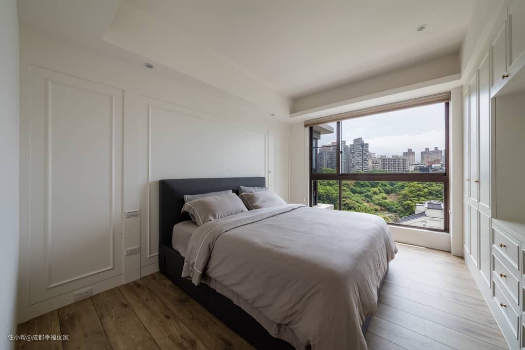 主卧以白色为主,落地窗让空间采光最大化,根据屋主的需求是想要将收纳最大化,在床尾做整面墙的白色定制柜体,增加衣物收纳空间,避免空间乱糟糟。 在墙面做简单的石膏线装饰,增加空间的层次感。在吊顶四周做简单的边吊设计,下方增加筒灯照明,让空间照明更温馨惬意。 在卧室做落地窗设计,不需要繁琐高级的装饰,也能轻松展现质感。卧室铺贴木地板,营造温润柔和的空间基调。