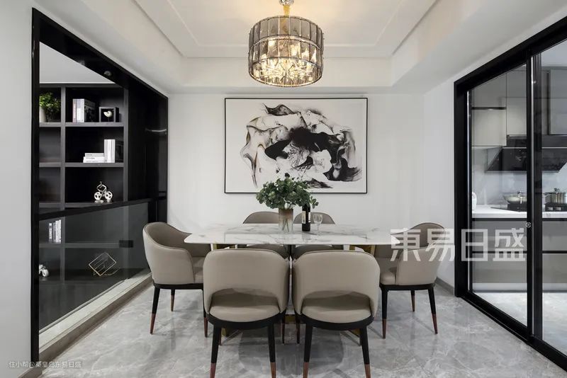 餐厅与开放式厨房相连色调依旧灰色系 整体氛围静谧安静