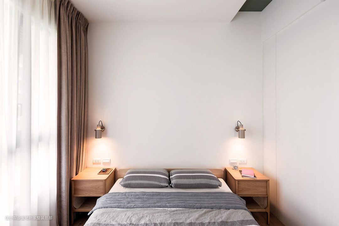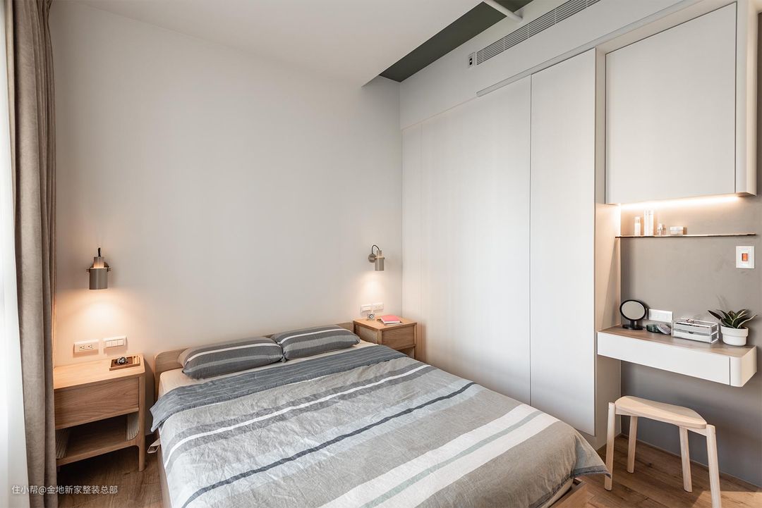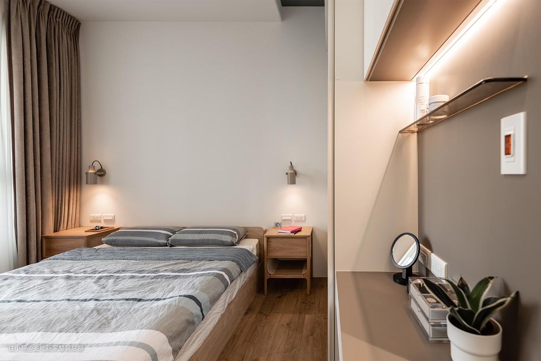 床头右侧墙体设计一面通顶收纳柜+简约梳妆台,考虑到空间大面积的白色,床的选择上我们采用原木床,与白色的空间形成对比,与原木地板达成统一性。