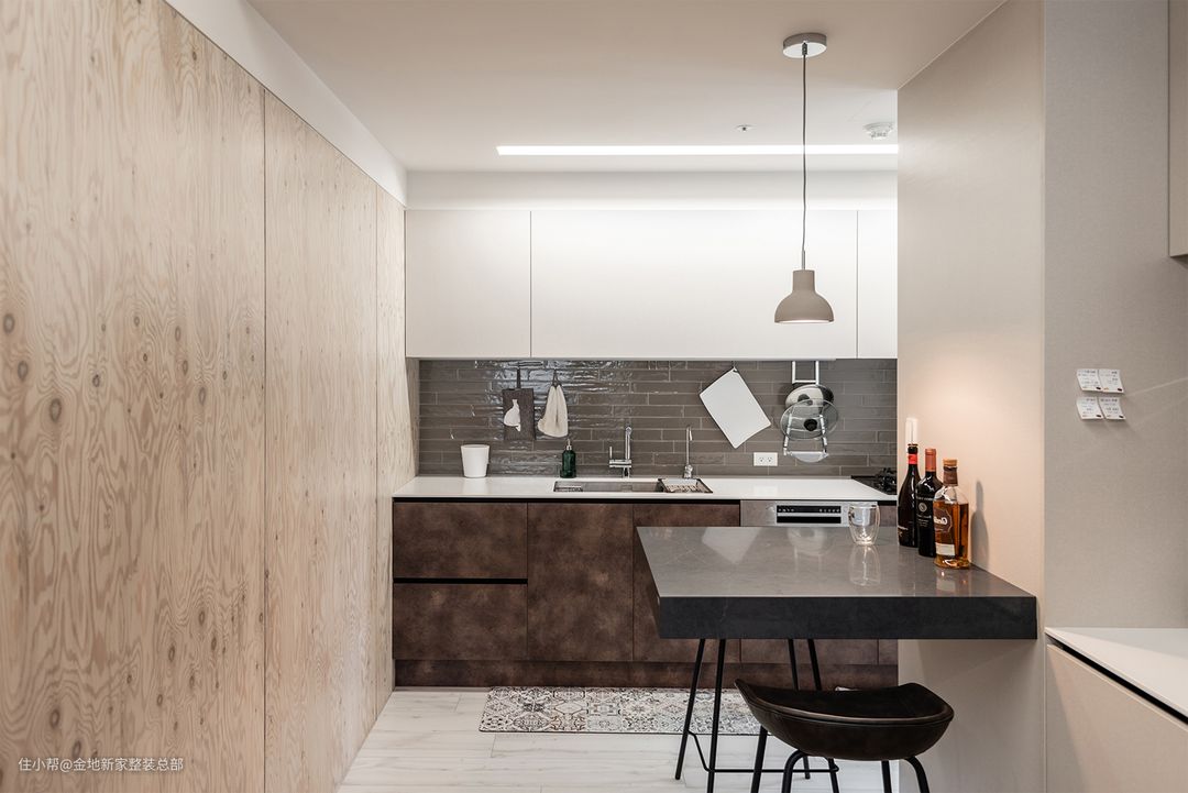 屋主更经常在工作台的大长桌上用餐,也可以和朋友们在那边聚餐,不过我们还是为屋主留出了可以吃简易早餐的地方,利用厨房的走廊空间,采用收纳柜+小型吧台的设计,做出了一个精致的吧台用餐区,也给厨房里大型电器预留空间。
