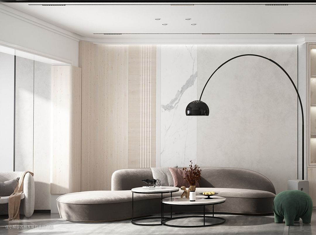 空间有界但设计无限,自在无拘束的客厅成为一家人的理想起居室。线性元素辅以木饰面曲面造型,以及鱼肚白大理石进行材质分割,营造更具有层次的空间环境。沉稳中融入一抹俏皮的绿,简洁明快,不争不抢,却成为整个空间最亮眼的存在!