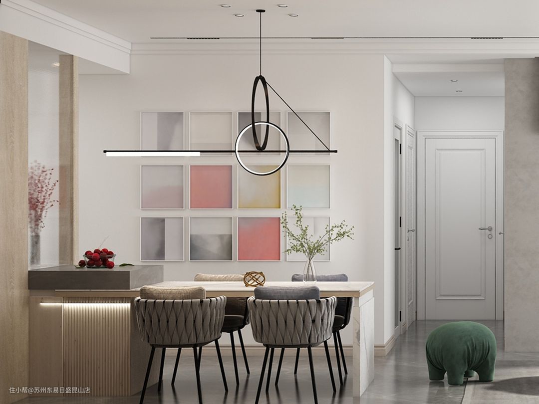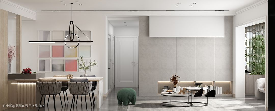 柔和的浅灰背景中,拼接深色护墙板打造丰富的层次感,软装布置也相得益彰,优雅和温情,就这样轻轻地印上你我心头。