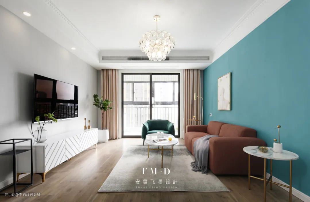 赭石褐色沙发与湖蓝色背景墙碰撞,极富空间个性。