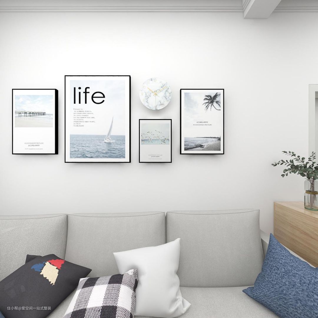 小户型的客餐厅,需要考虑采光、通透度的问题,这样即便是空间小,也不会看起来沉闷。白色乳胶漆通刷,简单明亮。搭配自然风景画,像是到了海边,身心放松。大理石蓝色花纹钟表,时尚美观。