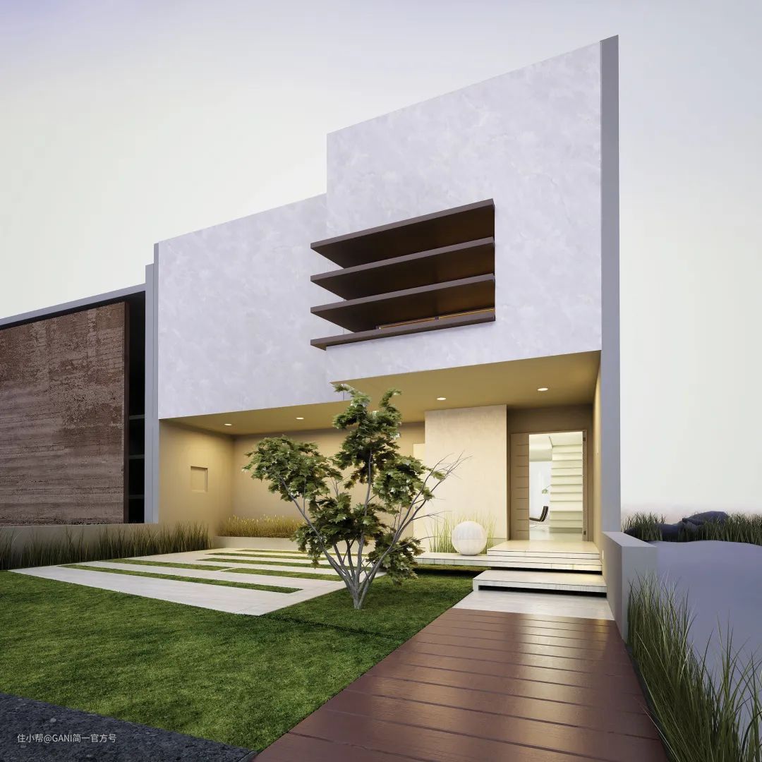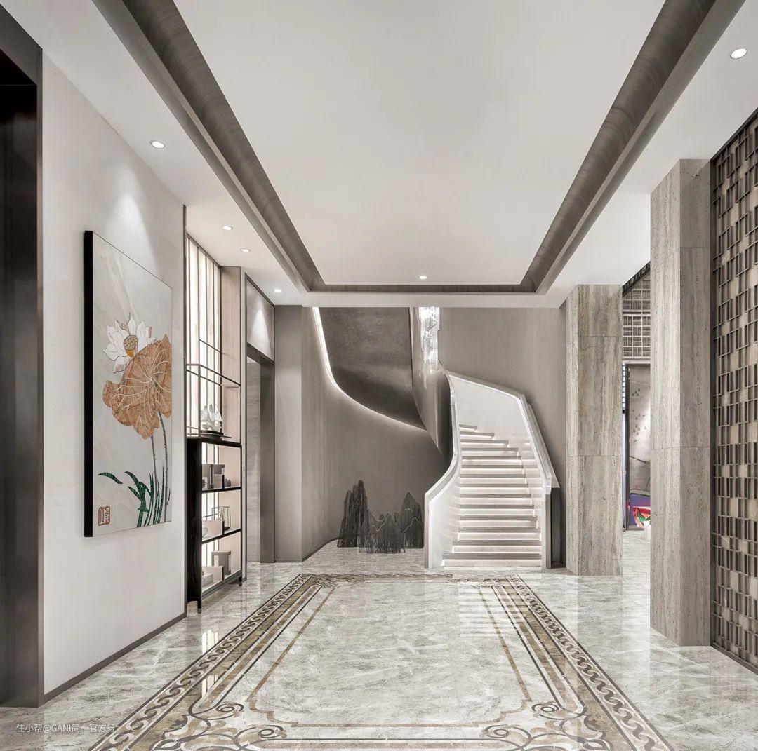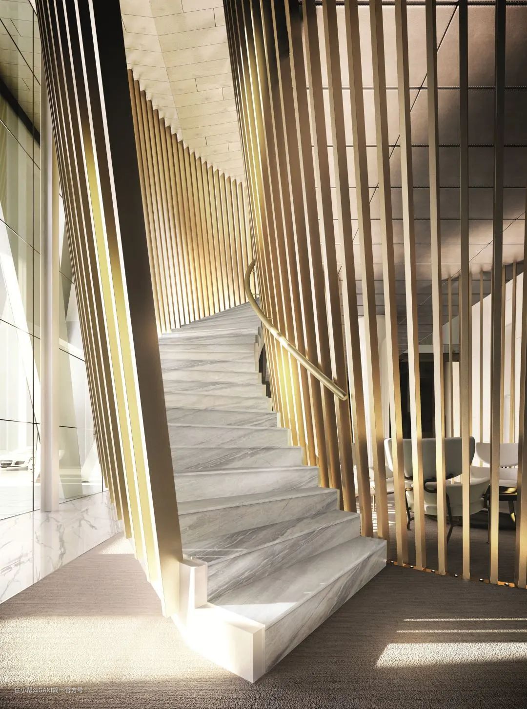 大理石纹理铺设楼梯,可以在扶手上多一些选择,木制或者金属都有不错的搭配效果,在冷淡的空间内增加一点暖色,中和色调的同时也塑造空间的精致。