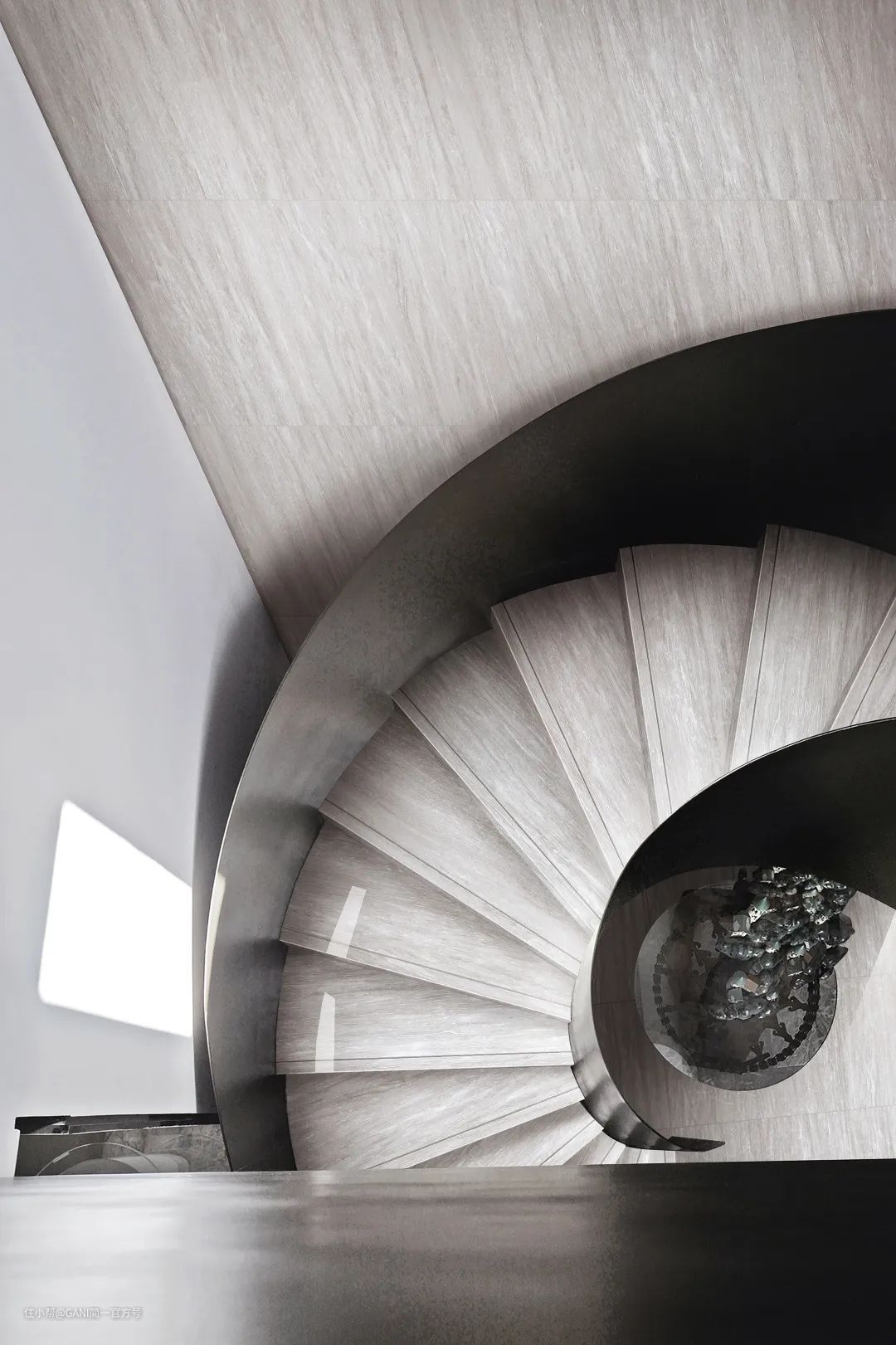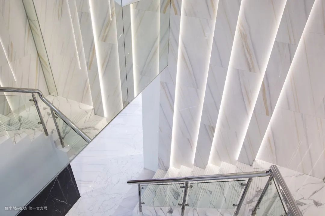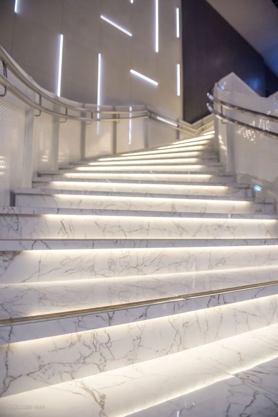 在楼梯这个狭窄空间,灯光是精髓所在。光赋予了空间、环境和物体的生命力,瓷砖作为空间中最大面积的物理存在,光线与瓷砖的互动很大程度上决定了空间的高级感。
