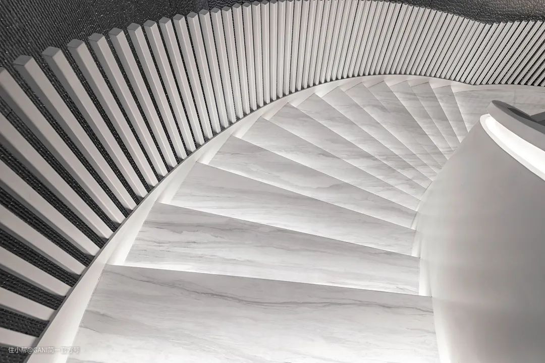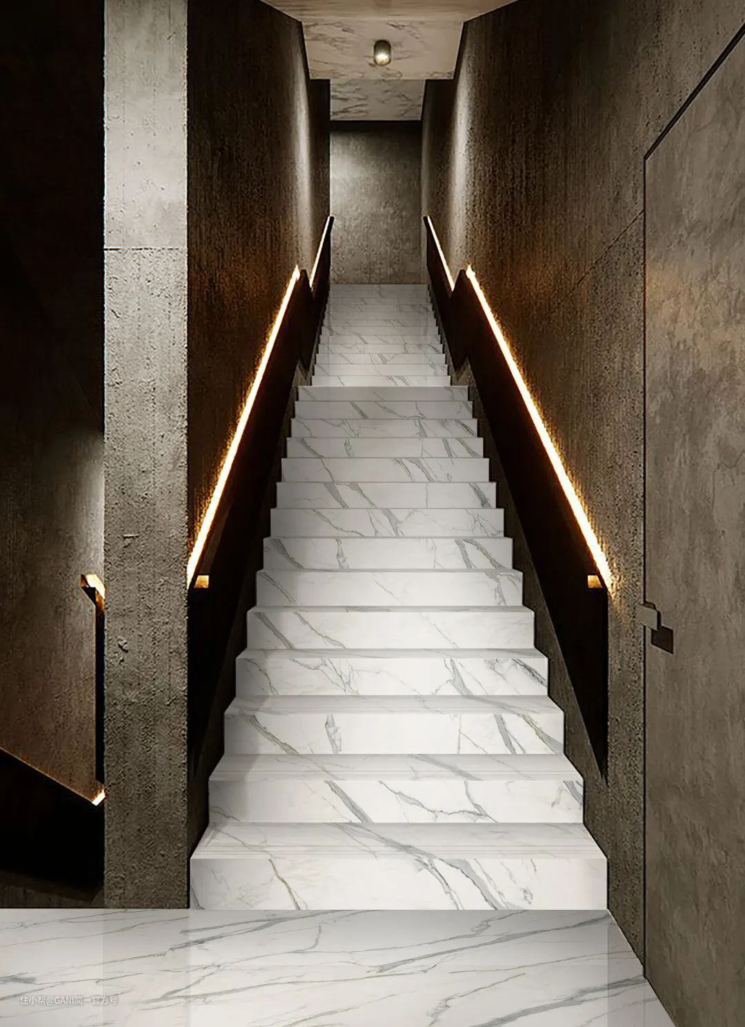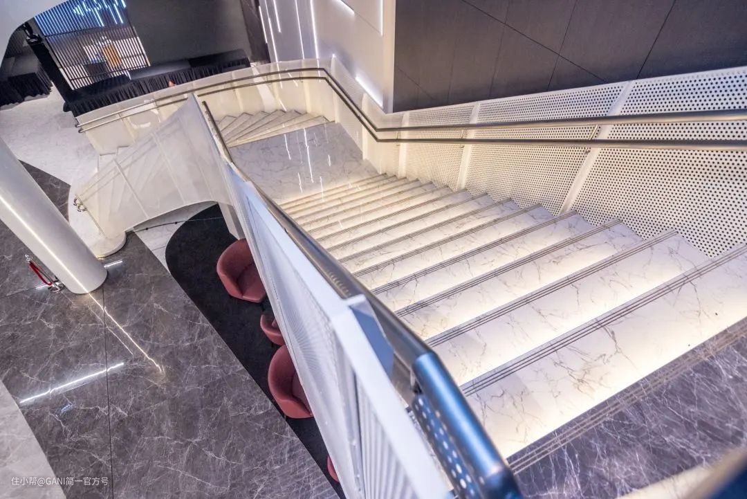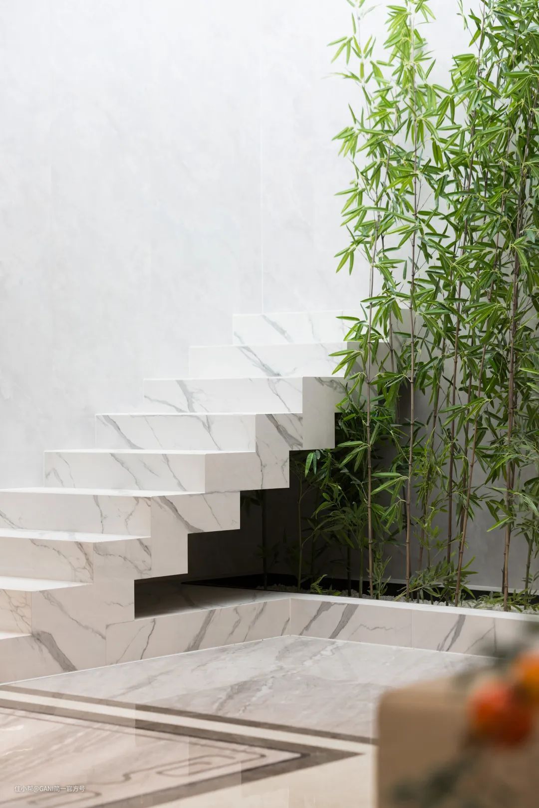 在楼梯这个狭窄空间,灯光是精髓所在。光赋予了空间、环境和物体的生命力,瓷砖作为空间中最大面积的物理存在,光线与瓷砖的互动很大程度上决定了空间的高级感。