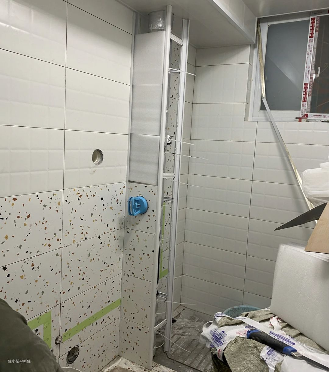 因为隔音棉有一定厚度,包完后有的小卫生间,可能会出现空间紧张,没法砌砖的问题,这时候,可考虑用连接杆+瓷砖的形式(如上图),中间缝隙处用隔音泡沫填充,既省了空间,还有助于提升隔音效果。