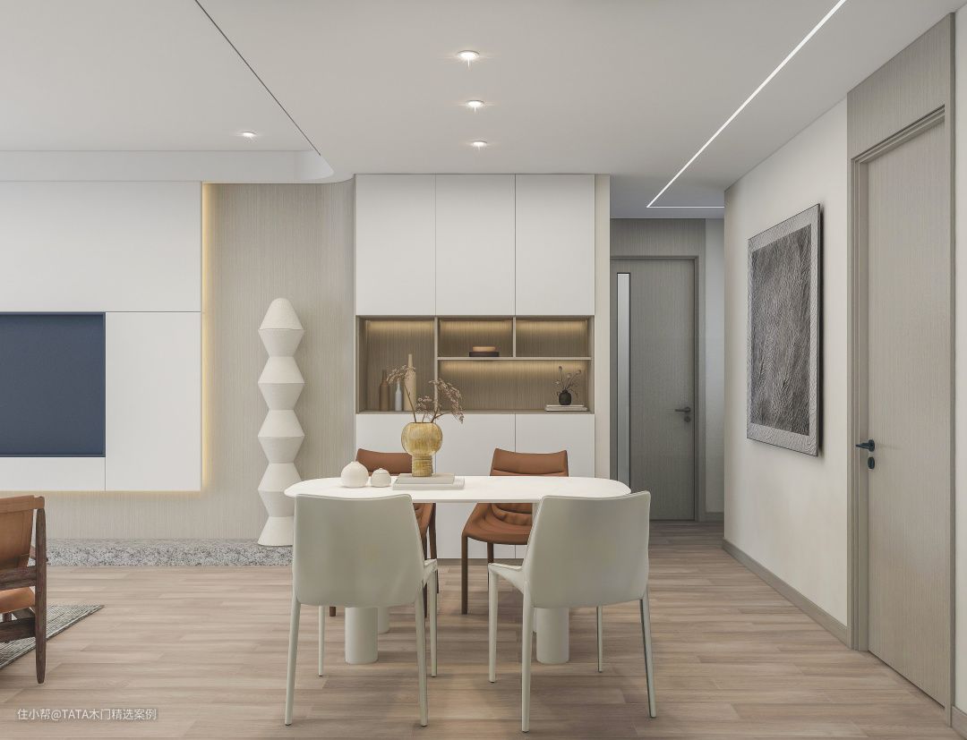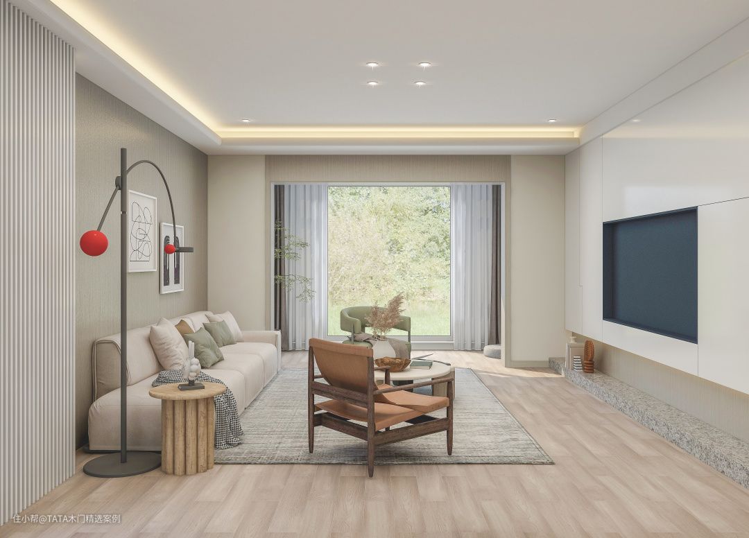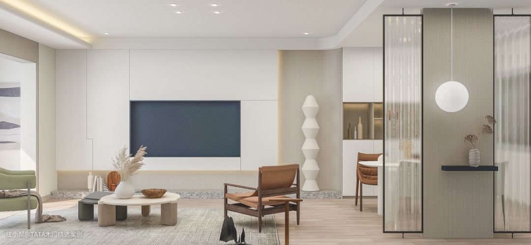 客厅整体颜色以白色作为主色调,搭配墙板银梨2号色,再在局部简单设计一些线条,极简带来的舒适感是五颜六色给不了的。