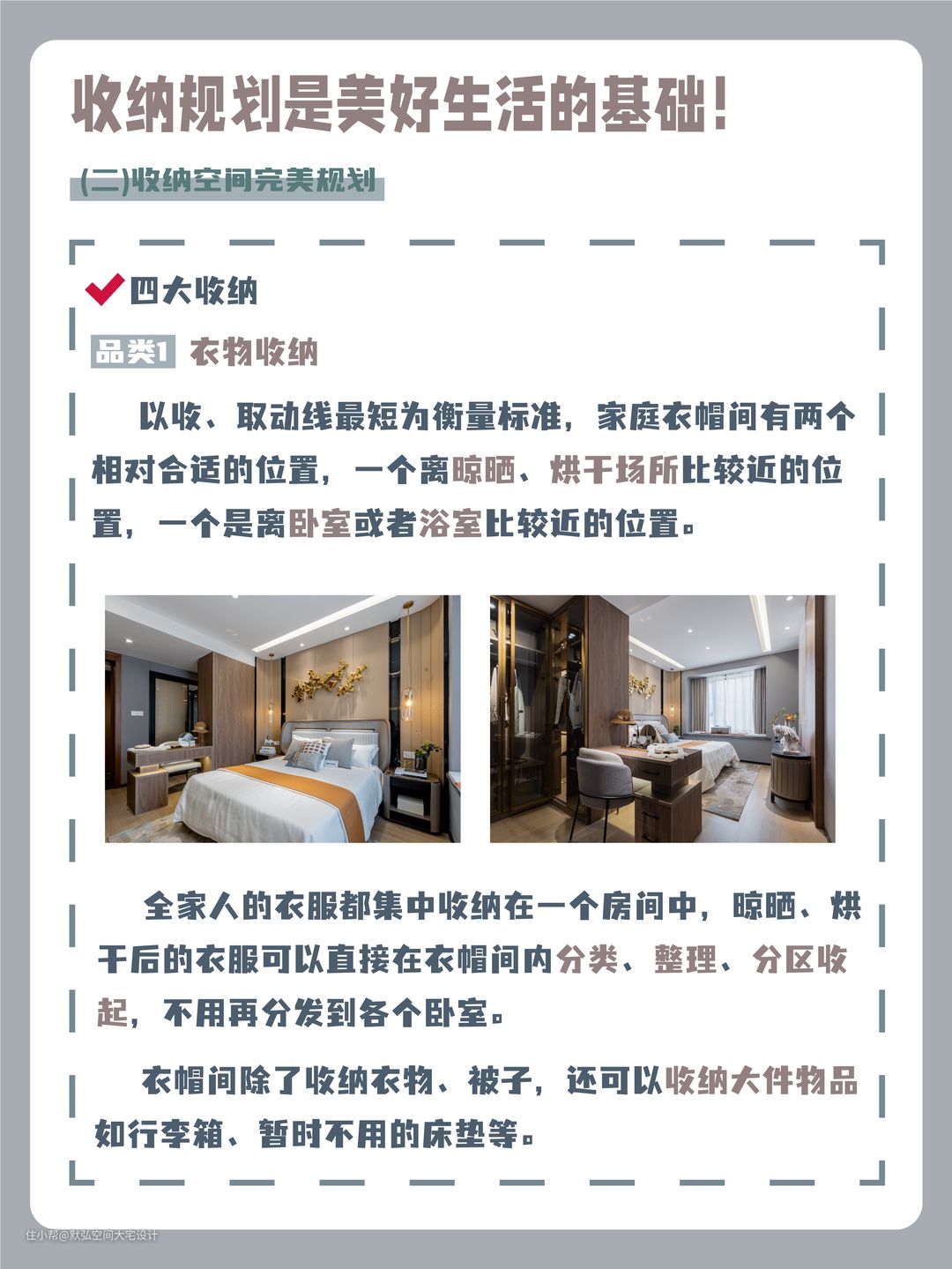 以收、取动线最短为衡量标准,家庭衣帽间有两个相对合适的位置,一个离晾晒、烘干场所比较近的位置,一个是离卧室或者浴室比较近的位置。