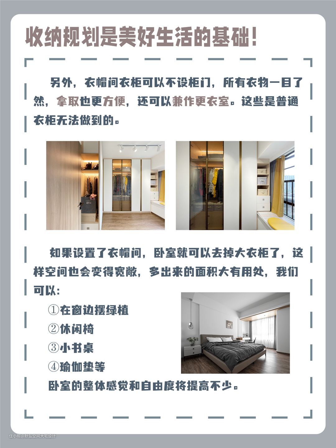 如果设置了衣帽间,卧室就可以去掉大衣柜了,这样空间也会变得宽敞,多出来的面积以在窗边摆绿植、休闲椅、小书桌、瑜伽垫等,卧室的整体感觉和自由度将提高不少。
