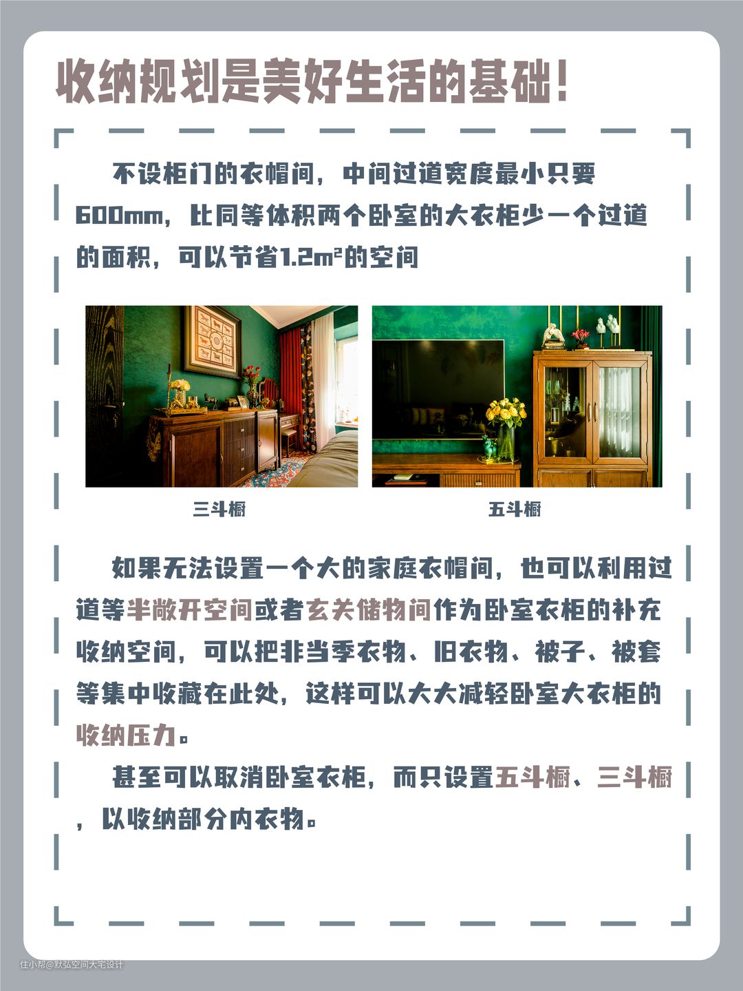 如果无法设置一个大的家庭衣帽间,也可以利用过道等半敞开空间或者玄关储物间作为卧室衣柜的补充收纳空间,可以把非当季衣物、旧衣物、被子、被套等集中收藏在此处,这样可以大大减轻卧室大衣柜的收纳压力,甚至可以取消卧室衣柜,而只设置五斗橱、三斗橱,以收纳部分内衣物。