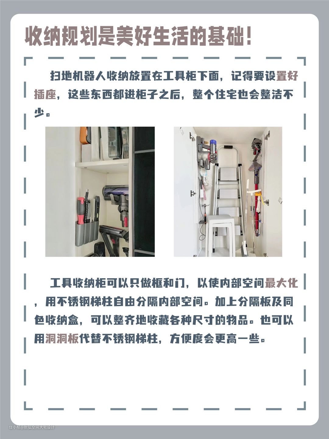 工具收纳柜可以只做框和门,以使内部空间最大化,用不锈钢梯柱自由分隔内部空间。加上分隔板及同色收纳盒,可以整齐地收藏各种尺寸的物品。也可以用洞洞板代替不锈钢梯柱,悬挂物品,方便度会更高一些。