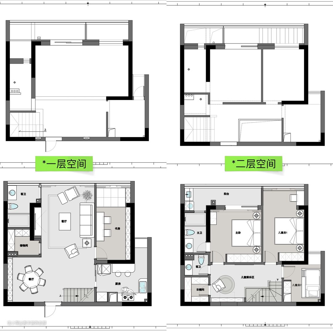 二楼利用原楼梯间做成衣帽间,满足女业主大量的衣物收纳要求;楼梯转弯处设计了儿童玩具收纳柜,增加空间使用率。