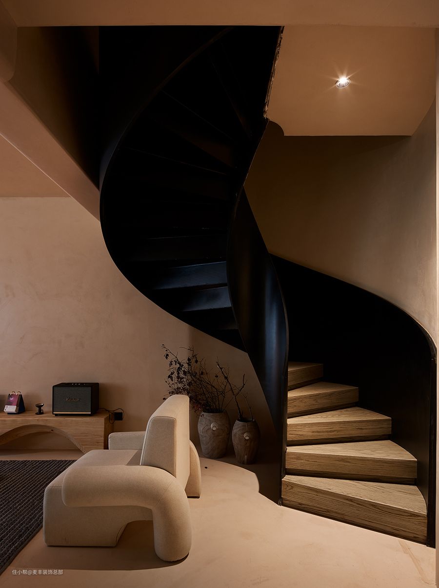 是由弧型梯衍生出来的楼梯型式,通常是围绕一根单柱布置。曲线自带的优雅、旋转的几何美感,好像有着特殊的吸引力想要把人吸进去。