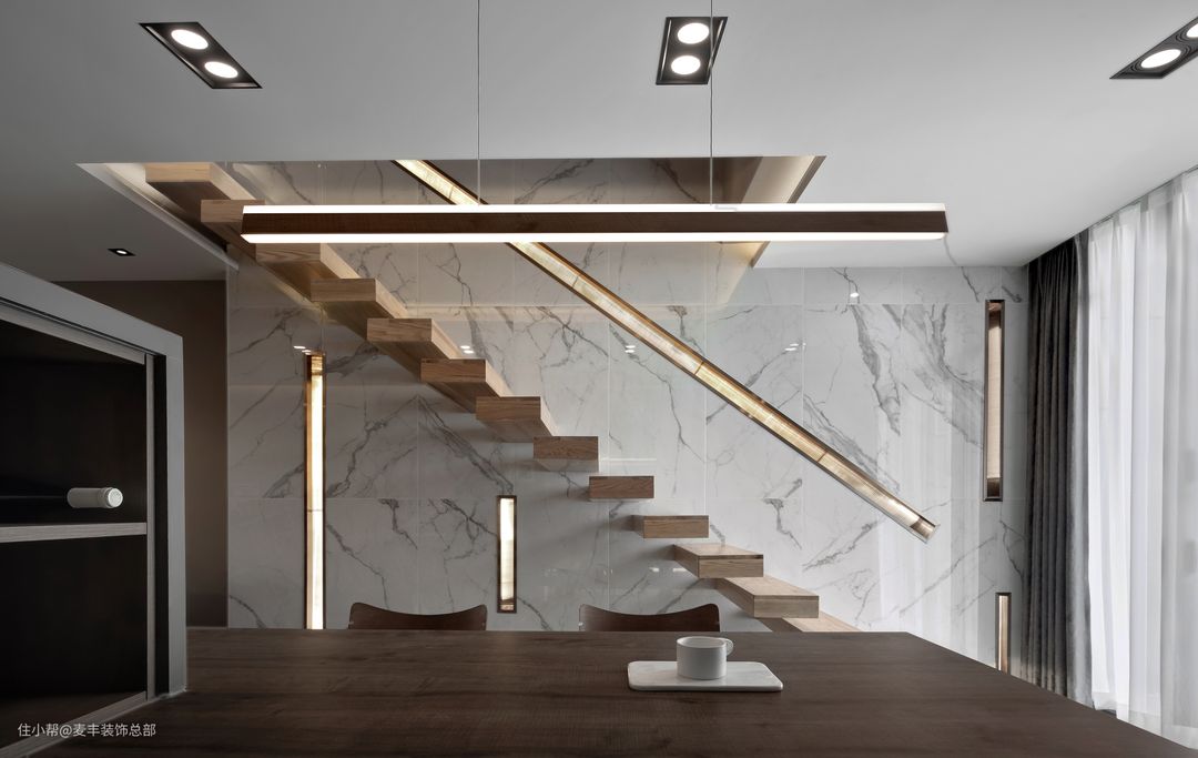 我们把一层所有空间都打通,共享成一个多功能会客空间,楼梯的设计也较为美观、宽敞。
