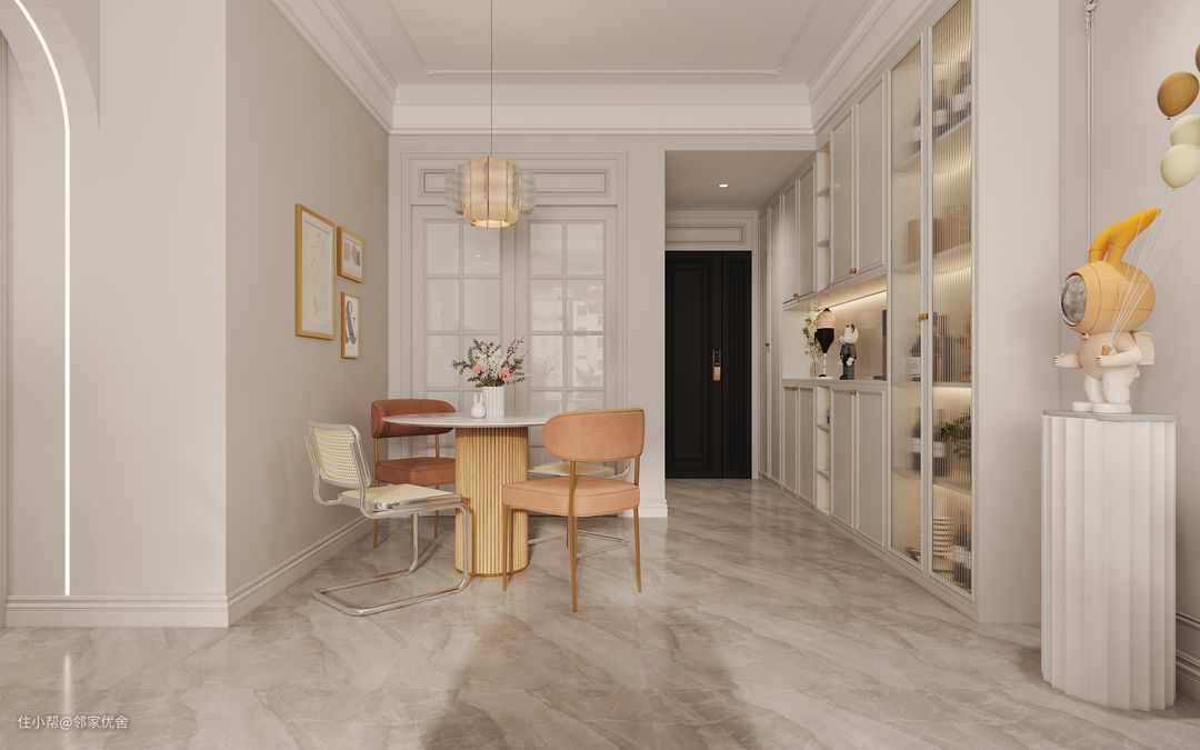 入门玄关柜与酒柜拼合放置,更显大气又节省空间,玄关柜中部掏空,便于放置物品,实用性更强。拐角处放置餐桌,搭配白色和黄铜色座椅,更显法式色彩搭配的冲突之美。