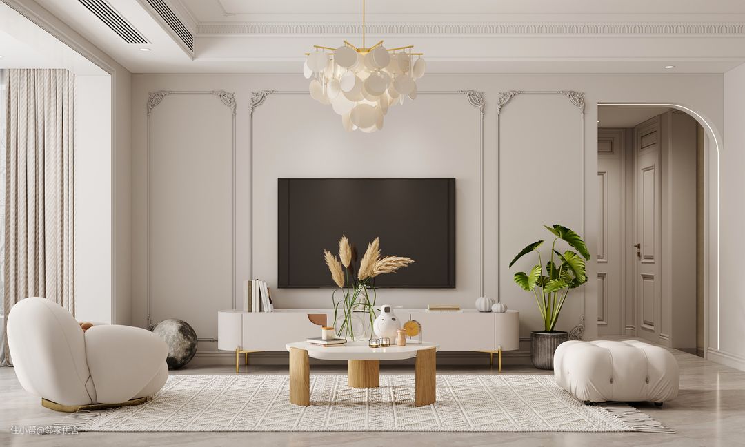 电视采用挂壁放置,下方电视柜即可收纳物品,也可摆放装饰,齐具美观与实用性。背景墙采用法式经典的线条与雕花装饰,细节处精细考究,颇具优雅气息。