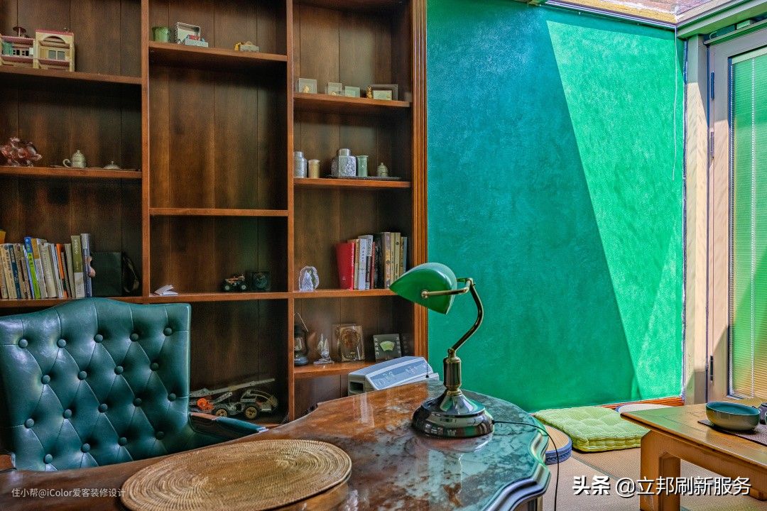 ▲三楼书房区。三楼是业主夫妻的私密空间,主卧外侧区域打造成了集业主学习、办公和休闲喝茶于一体的空间。靠近露台的墙面选用了业主喜爱的绿色。(墙面效果:海藻岩,墙面色号:野薄荷GA4600-1)