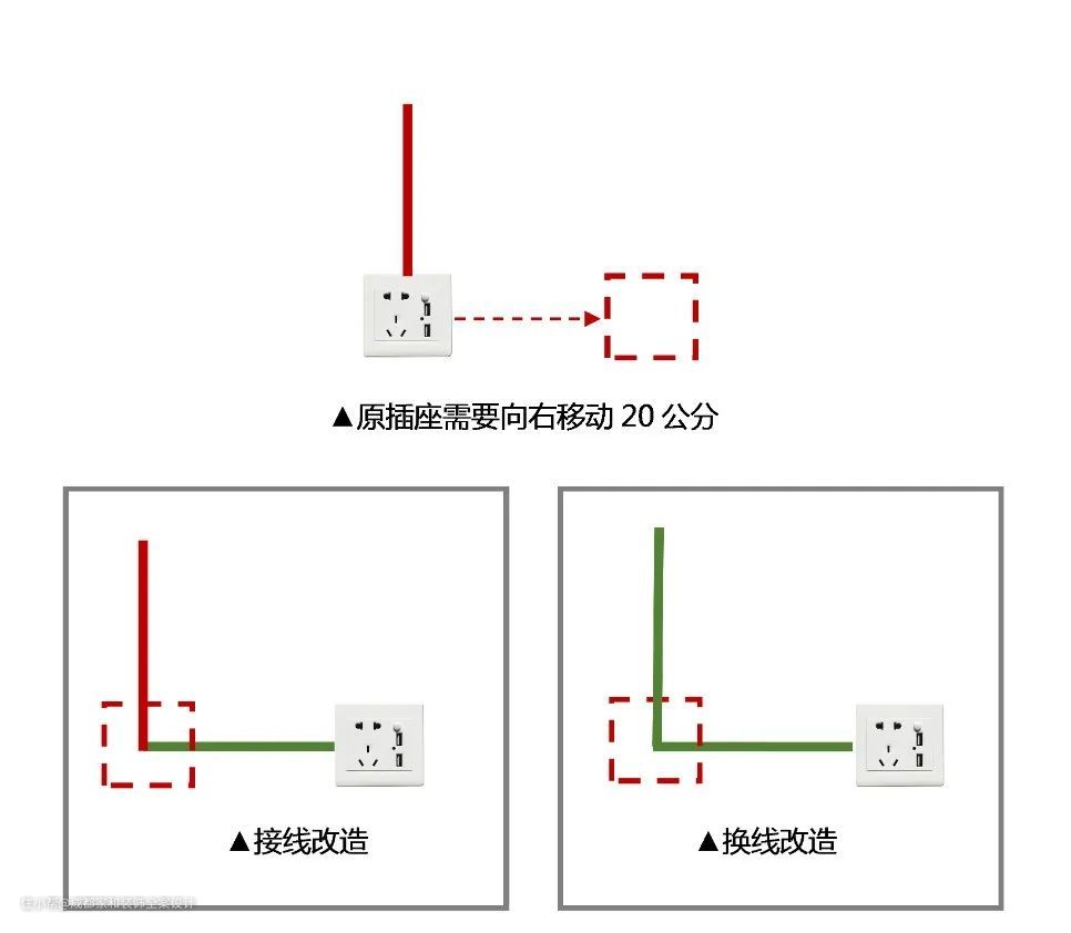 举个例子,比如沙发背景墙上原有的插座距离太近,放了沙发容易被挡住,在原有的线路质量还不错的情况,既可以接线移位,也可以直接把回路的线换掉重新布线,如下图所示: