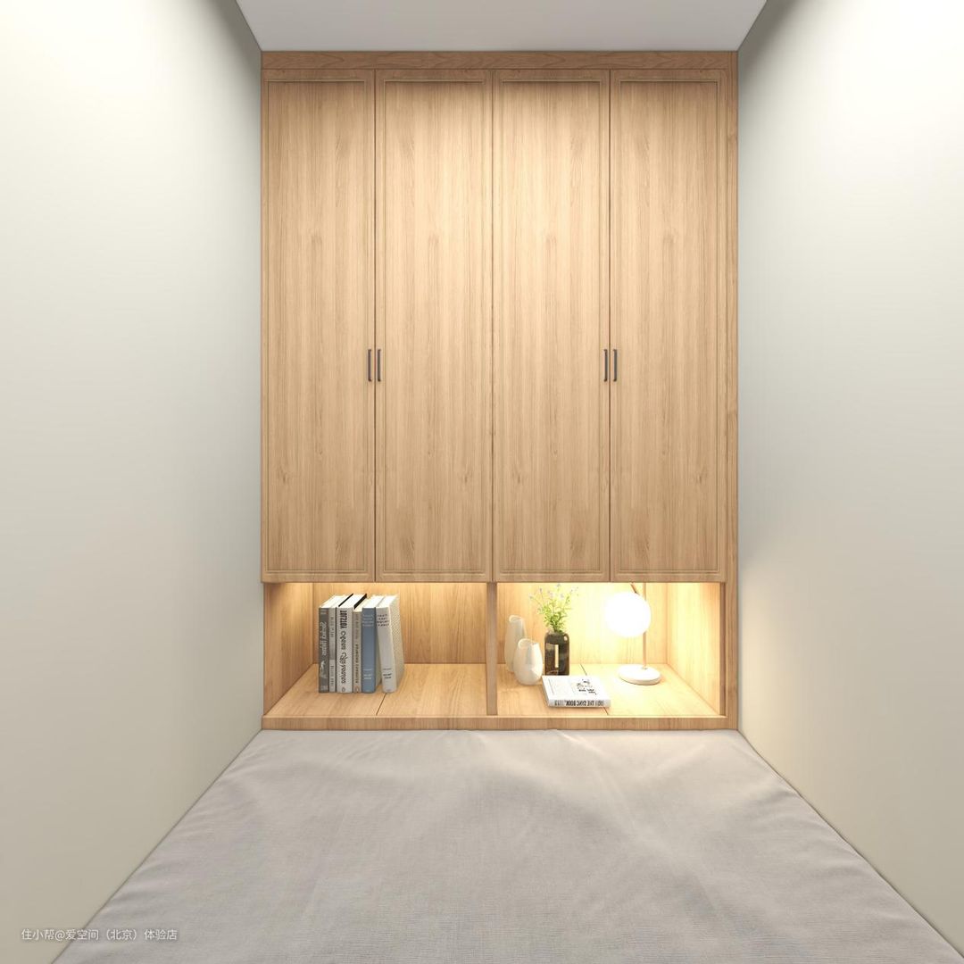这个空间面积很小,最里面打了一个柜子,柜子上方可以放一些衣物收纳,下面是普通的柜子可以当床头柜使用,放一些杂物什么的都可以。外面是一张小床,可以躺下一个人,家里空间面积小,这么安排也可以凑合一下。