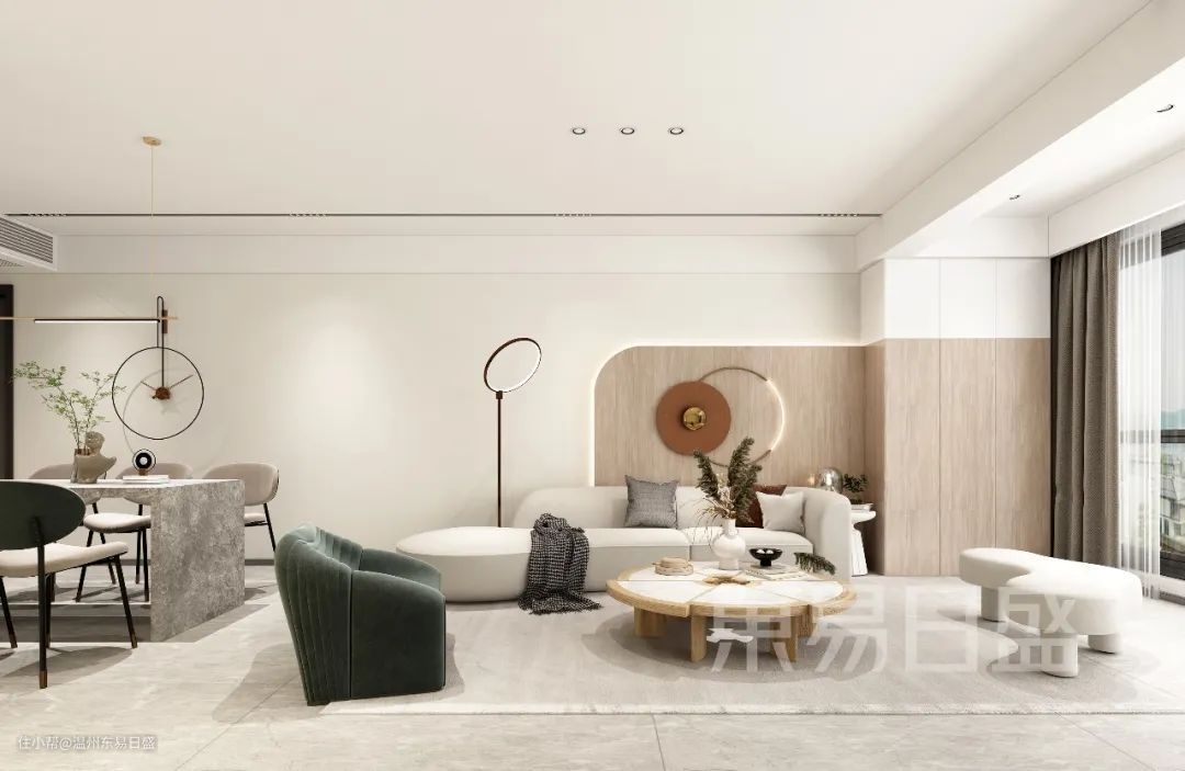 以白色和原木色装饰打造整个空间清新简约的氛围,木格栅与大理石结合的悬浮电视背景墙,丰富了空间的层次,安宁静谧的居家氛围不期而至。由此形成的两条动线模式,为通往卧室、餐厅带来更多趣味感。