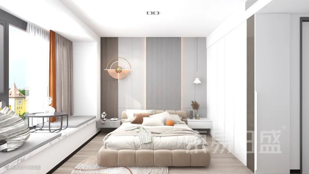 移步主卧,奶茶色系软包的床头靠背与木栅格背景墙,营造出静谧的睡眠环境,伴居者一夜香甜好梦,舒心迎接明天的到来。一切从简,构筑一方慵懒小憩、静谧的闲适之地。