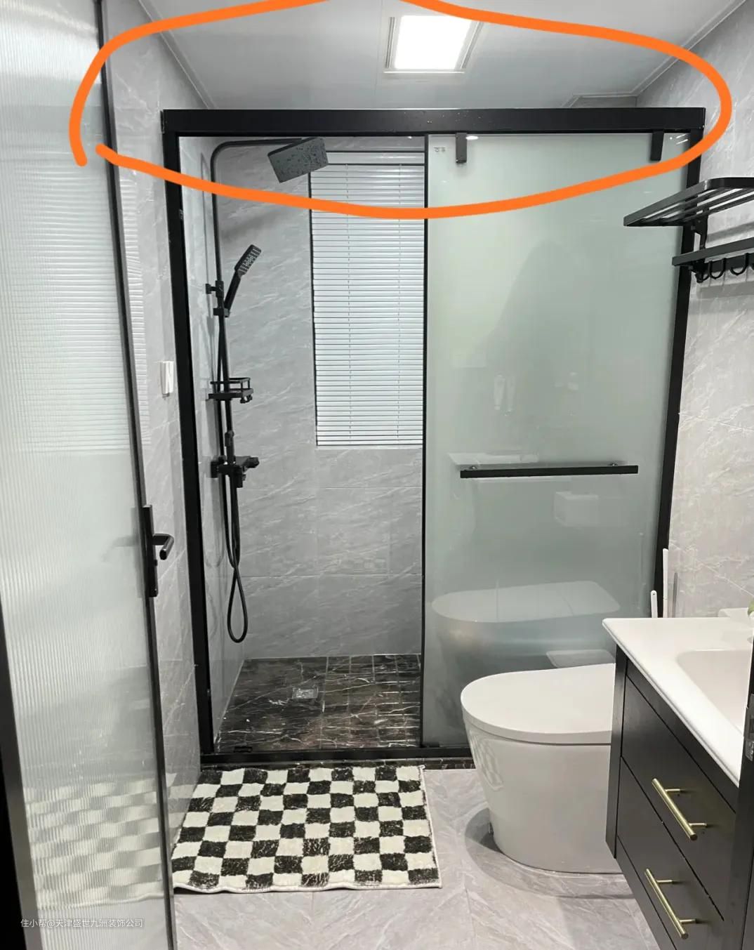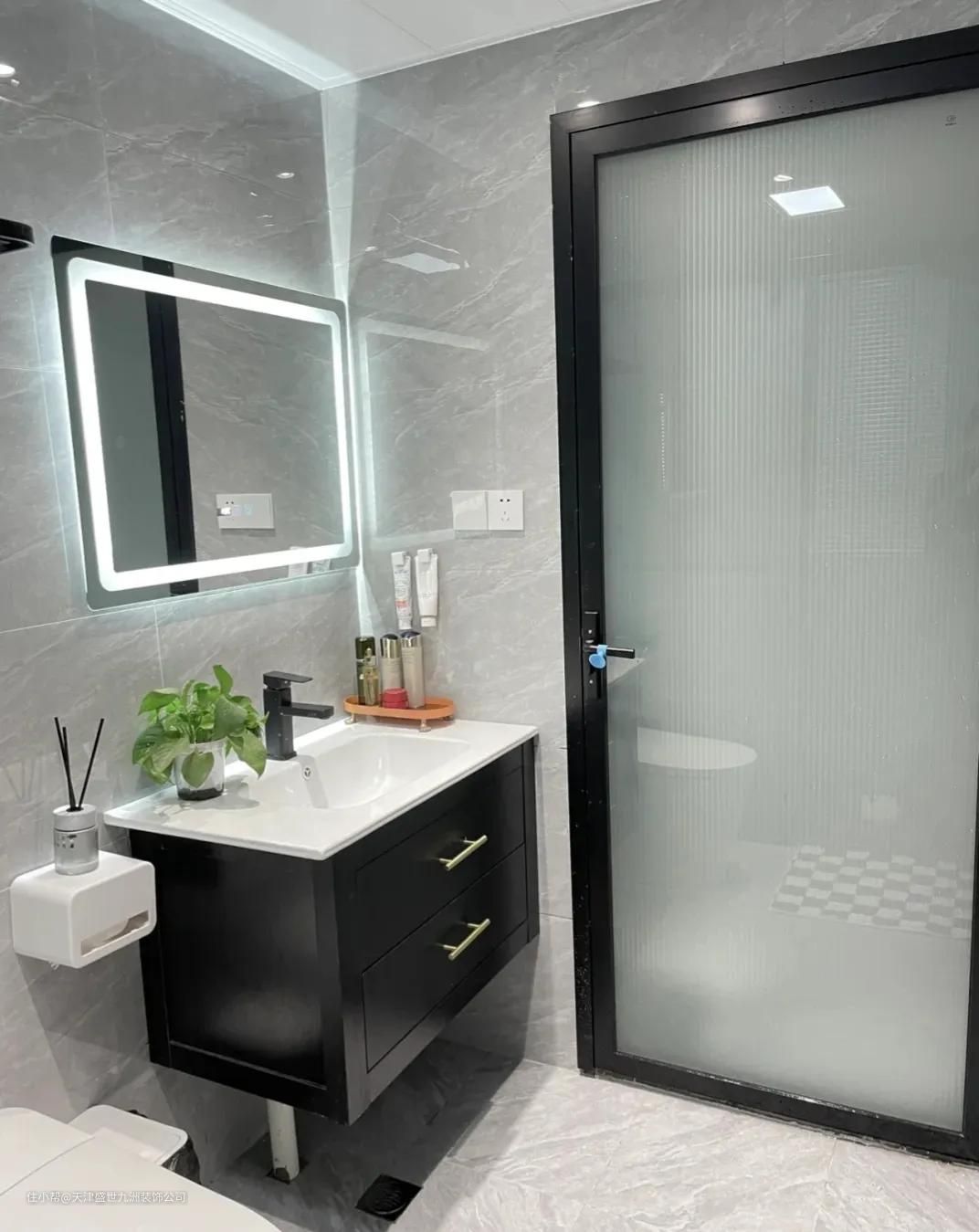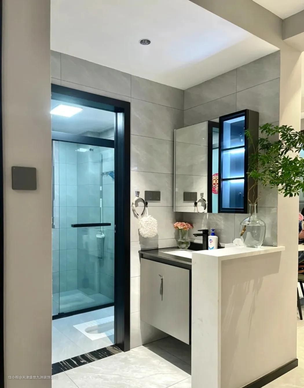 也有一些人在卫生间装一个不到顶的玻璃洗浴间,我个人是不太赞成这种伪干湿分离的。虽然水不会乱溅也不会到处流,但水汽还是会充满整个房间,如果人多或者洗浴时间过长,基本跟没装一样了。