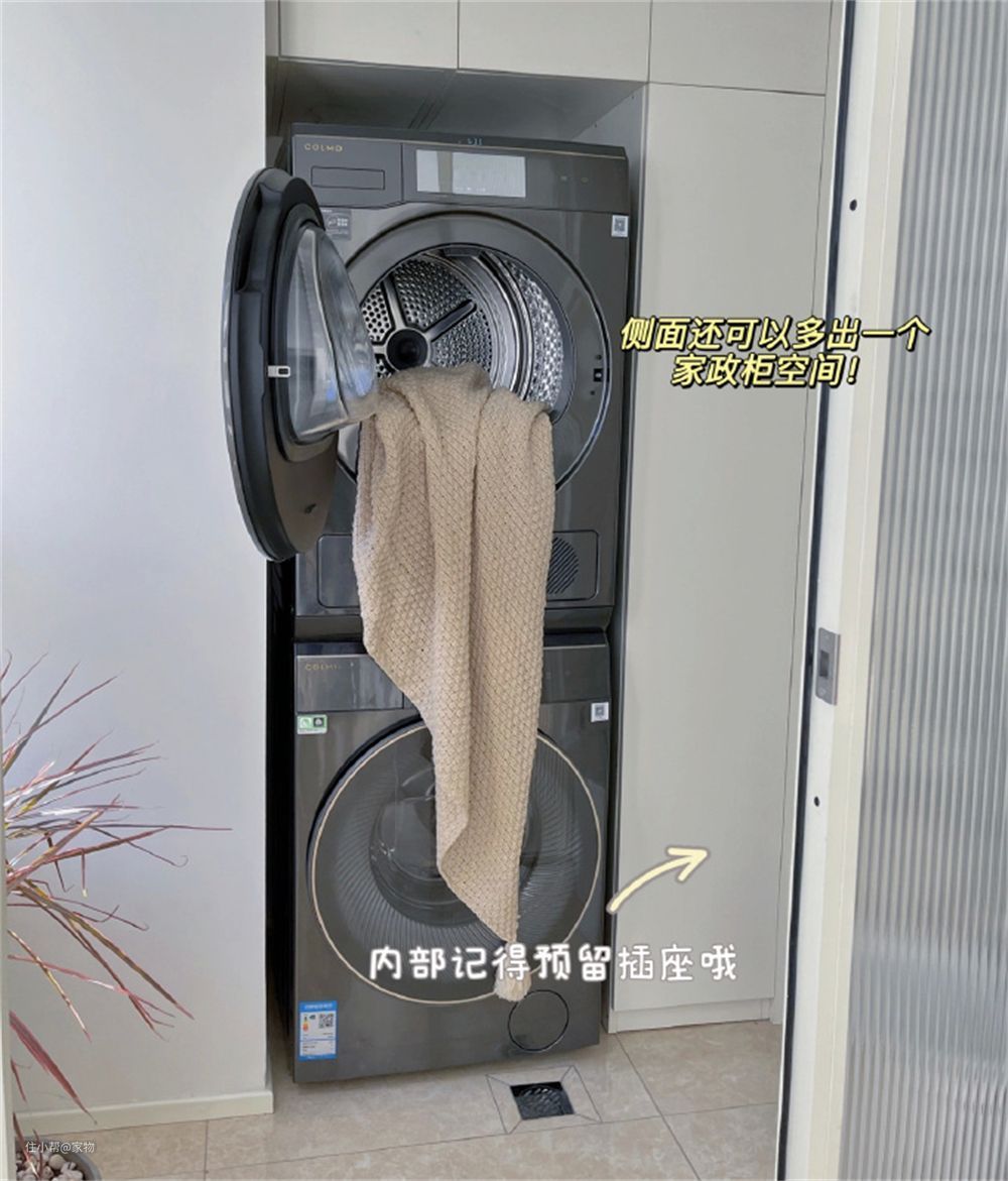 洗衣机和烘干机堆叠摆放到一起,同时用通顶柜填补冗余空间,将纵向空间完美利用起来,收纳下了更多的清洁和洗衣用品,还是蛮方便的。