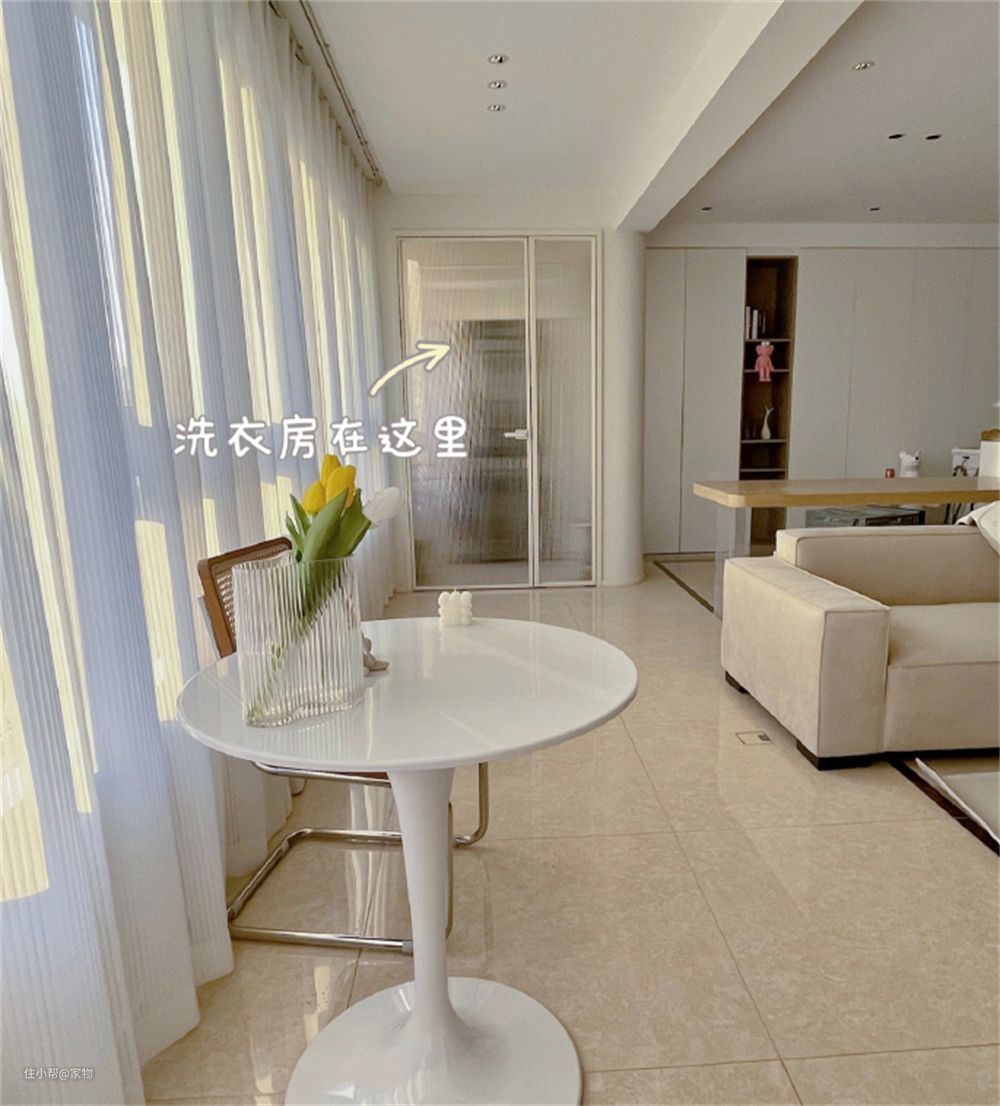 在阳台的生活区中,姑娘利用长虹玻璃门,将洗衣机、烘干机和晾衣架统统隐藏收纳其中,这种长虹玻璃也选择了超白的,看起来既透光,又能起到不错的遮挡作用。