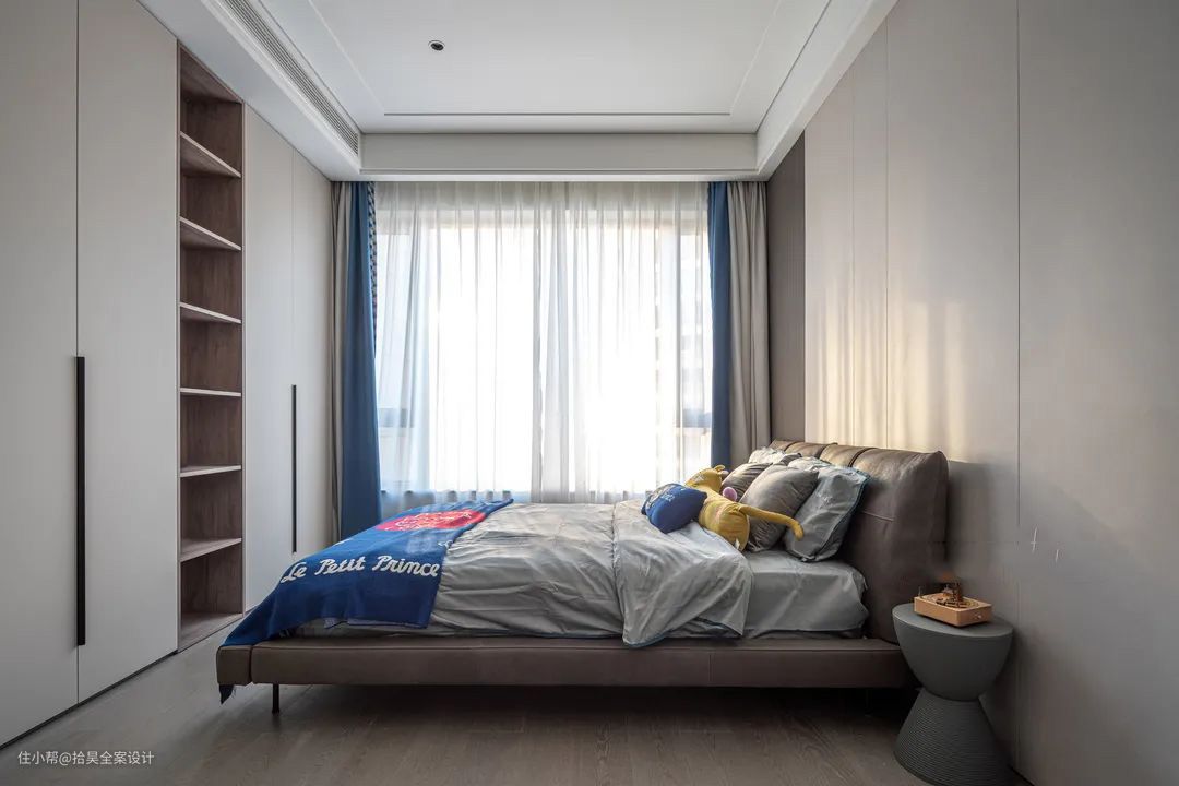 这间卧室相对较小,但家居用品依旧考究。通顶的衣柜设计,避免上方落灰,便于清扫,同时足够放得下个人的衣物。深棕色皮质床头靠背绵软亲肤,临睡前翻阅一本书,也能拥有舒适的体验感。
