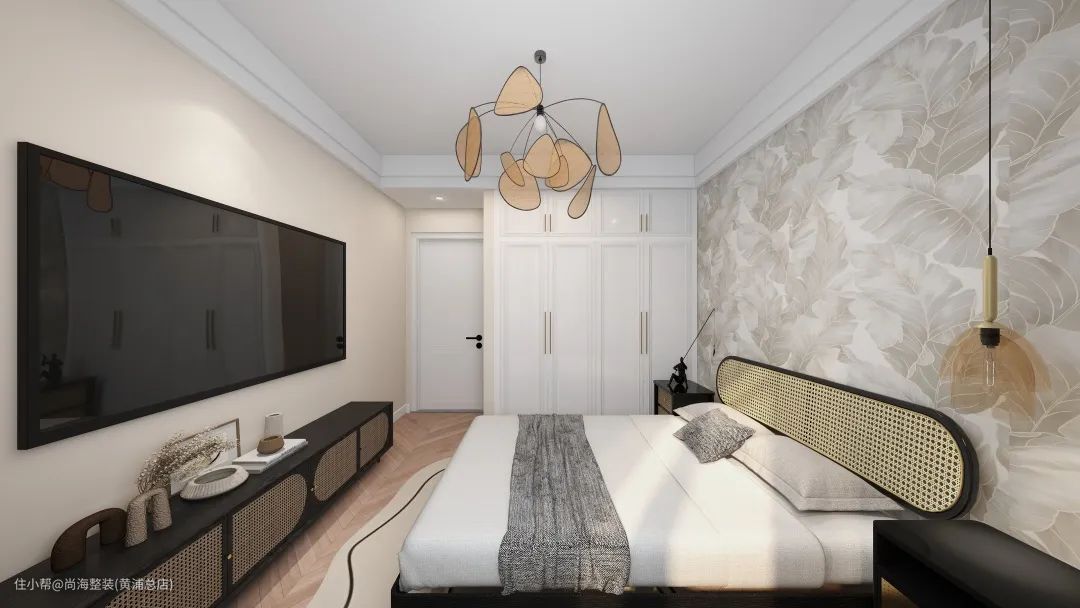 白色简洁的衣柜和床品,搭配大叶纹理的壁纸背景,使整个空间简繁有序,黑色、藤木色和金色加以点缀,使整个空间新增了几分优雅精致。