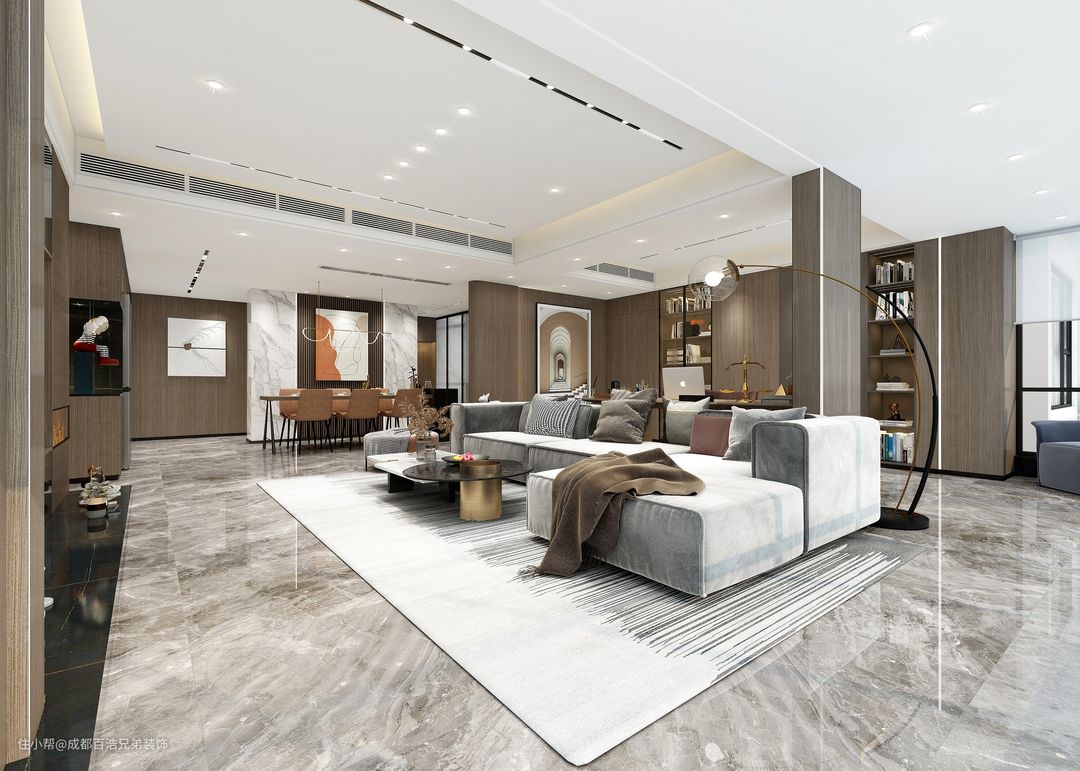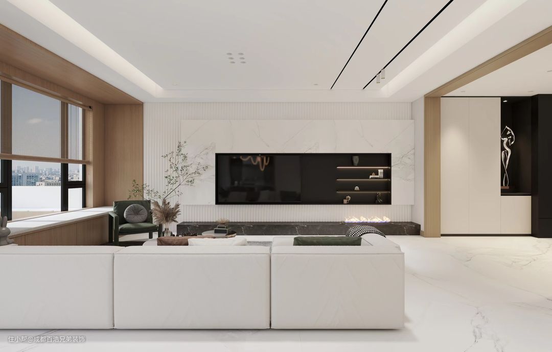 5、客厅可以做整墙电视柜,增加收纳同时隐藏式柜体不会让空间显得凌乱,如果要做开放格,最好不要超过柜体面积的20%。