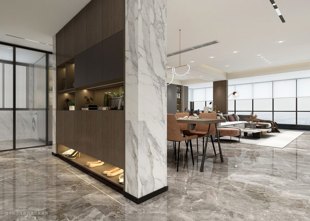 1、玄关柜底下留出常用鞋的鞋位,进门就不会很乱糟糟了。门口预留感应灯,柜子安装灯带,换鞋和找鞋都更方便。