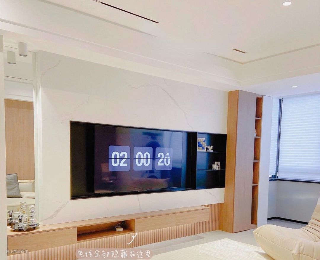 好多家里的背景墙设计的很用心,最后却毁在了一堆电线上,但屋主家并没有,提前预埋了一根双头50管,把线路从中穿过去,再集中收纳到下面的抽屉里,隐秘性非常好。