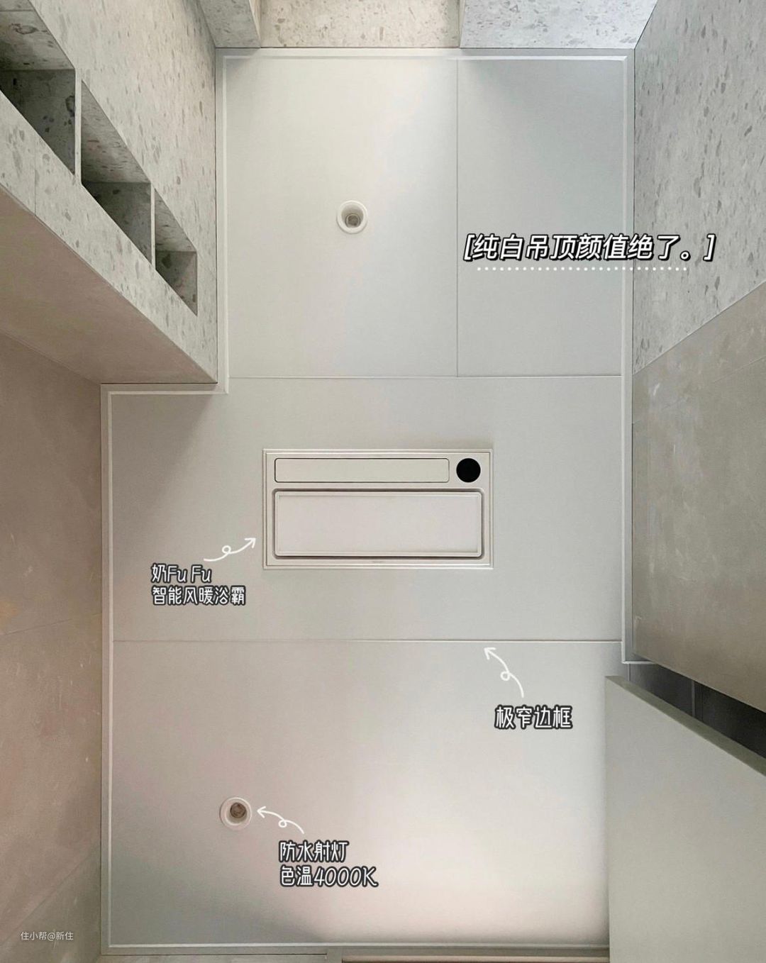 ①吊顶:蜂窝大板,比铝扣板整体性好,纯白色板子+黑色灯杯,没开灯的情况下,也很出效果。