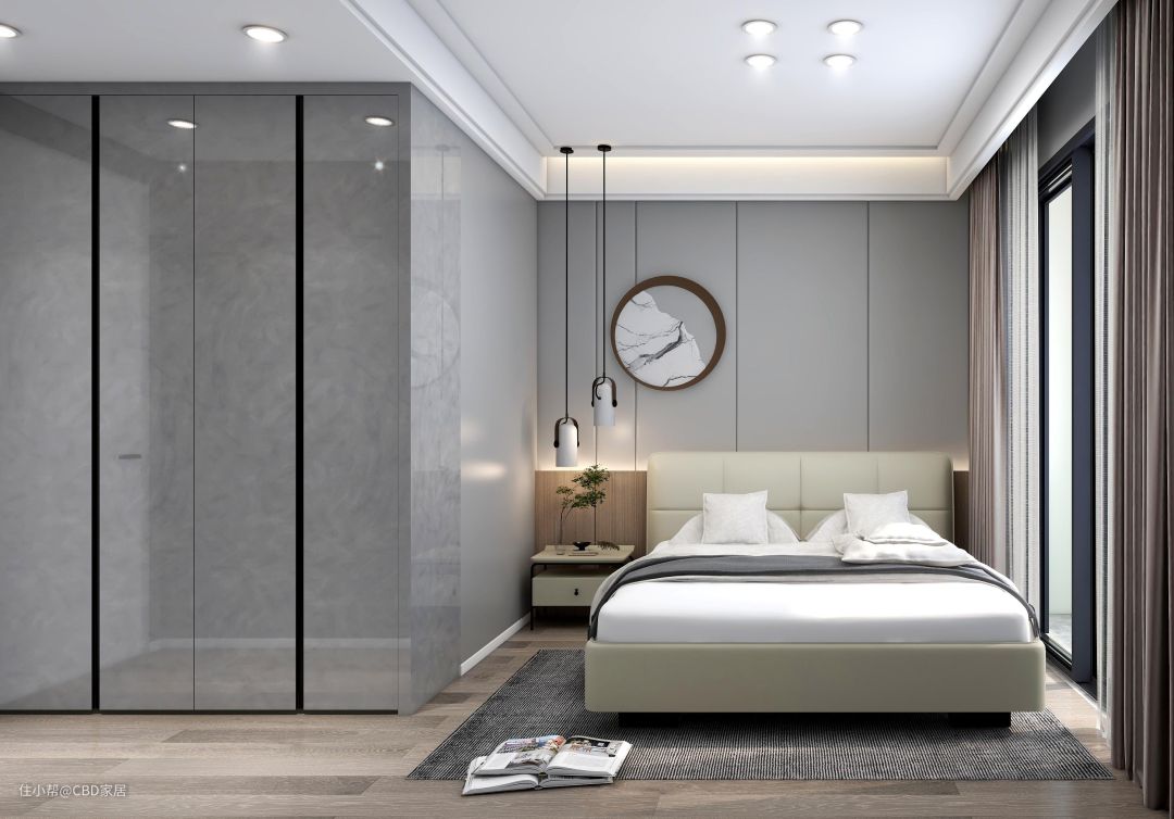 灰调的墙色与浅胡桃色地板相得益彰,空间安谧恬静;射灯、线灯装饰,暖光照明更显温润。CBD家居·白金 | BS6029-1软床,米色纯净温柔,呼应浅色空间,安稳睡眠,格纹点缀靠包,皮质触感柔滑,躺靠之中得到质感生活体验。