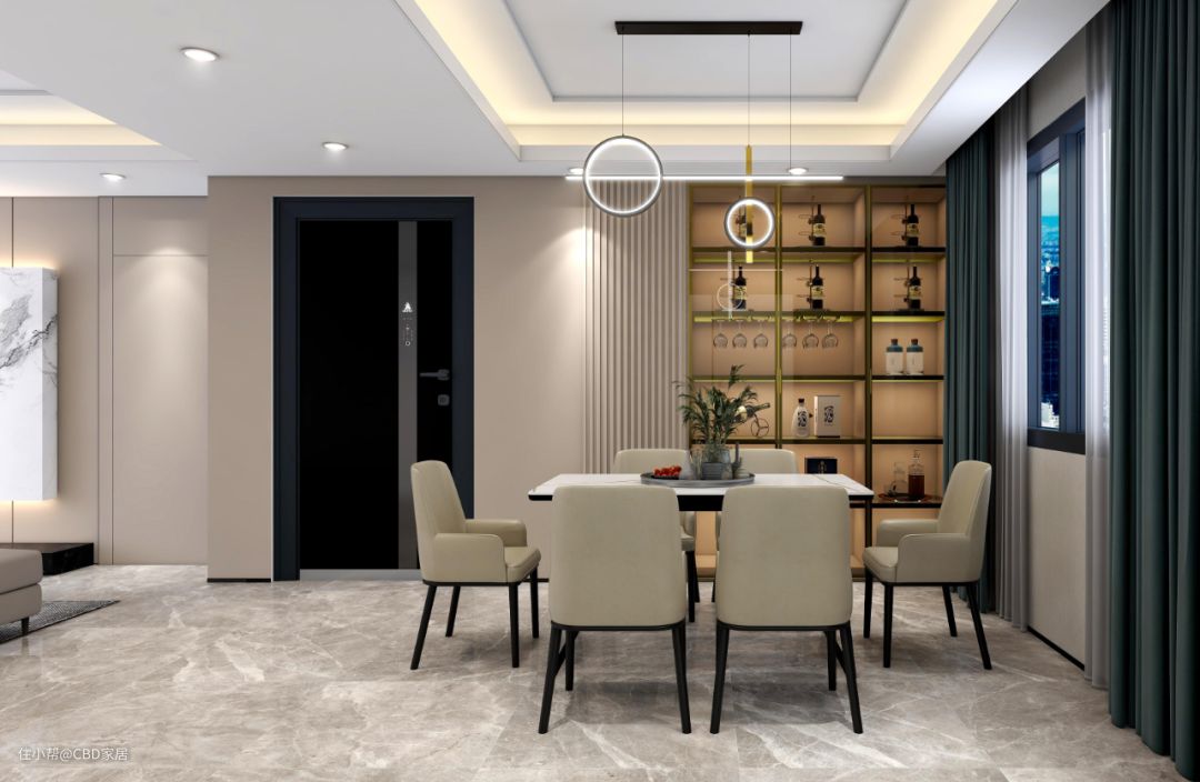 打破传统格局,客餐厅一体化设计赋予空间更多可能,开阔明朗的观感奠定轻松的用餐氛围。CBD家居·白金 | BJ190餐桌,劳伦白金岩板+黑色喷砂桌脚支撑,形色简约纯粹,颇有设计感的入墙柜,置物收纳,呼应别具生活感的舒适日常。