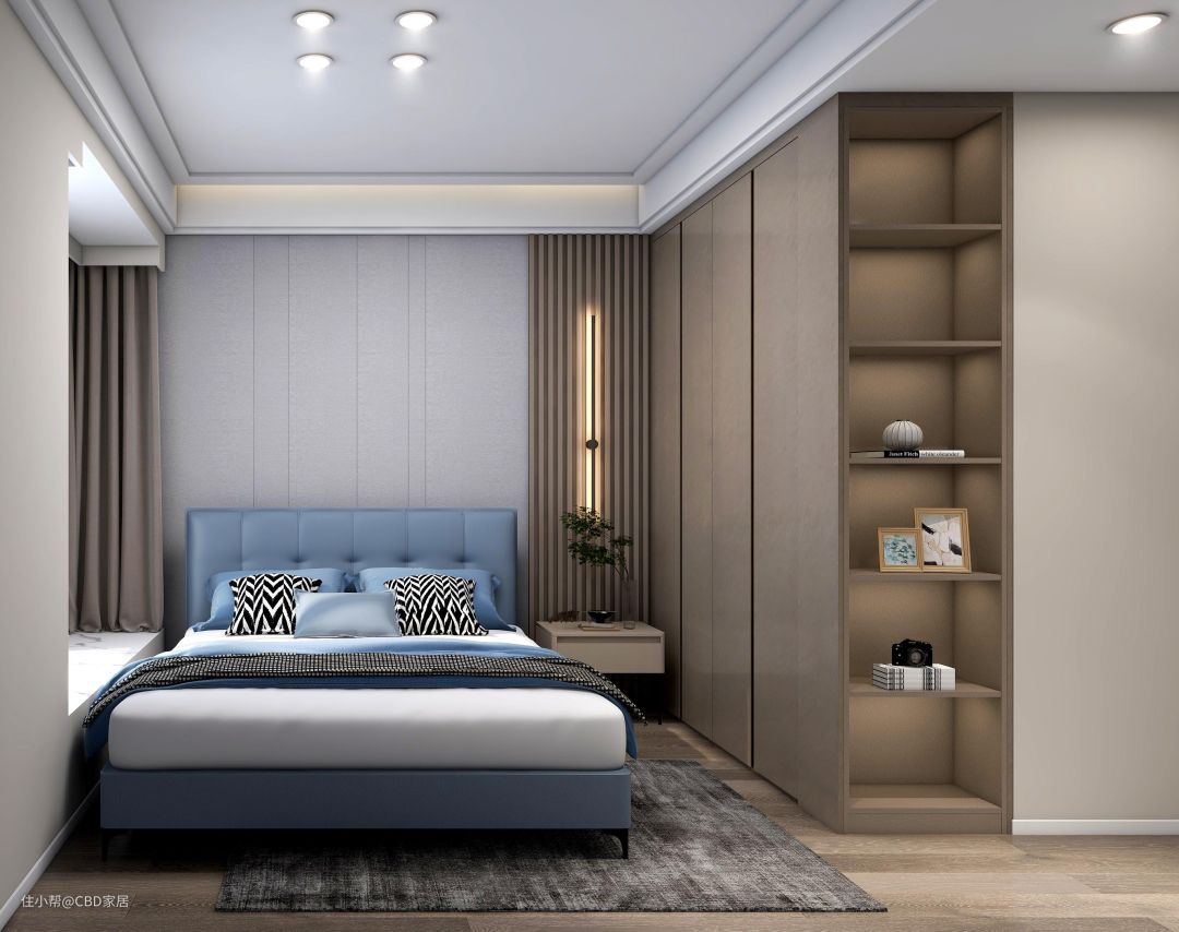 蓝色为空间注入静谧气韵,CBD家居·白金 | BS009软床放置一隅,飘窗设计恰到好处,小空间得到延展,更显舒适休闲。格栅背景板与定制柜相呼应,色彩和谐,营造淡雅自然的睡眠氛围。
