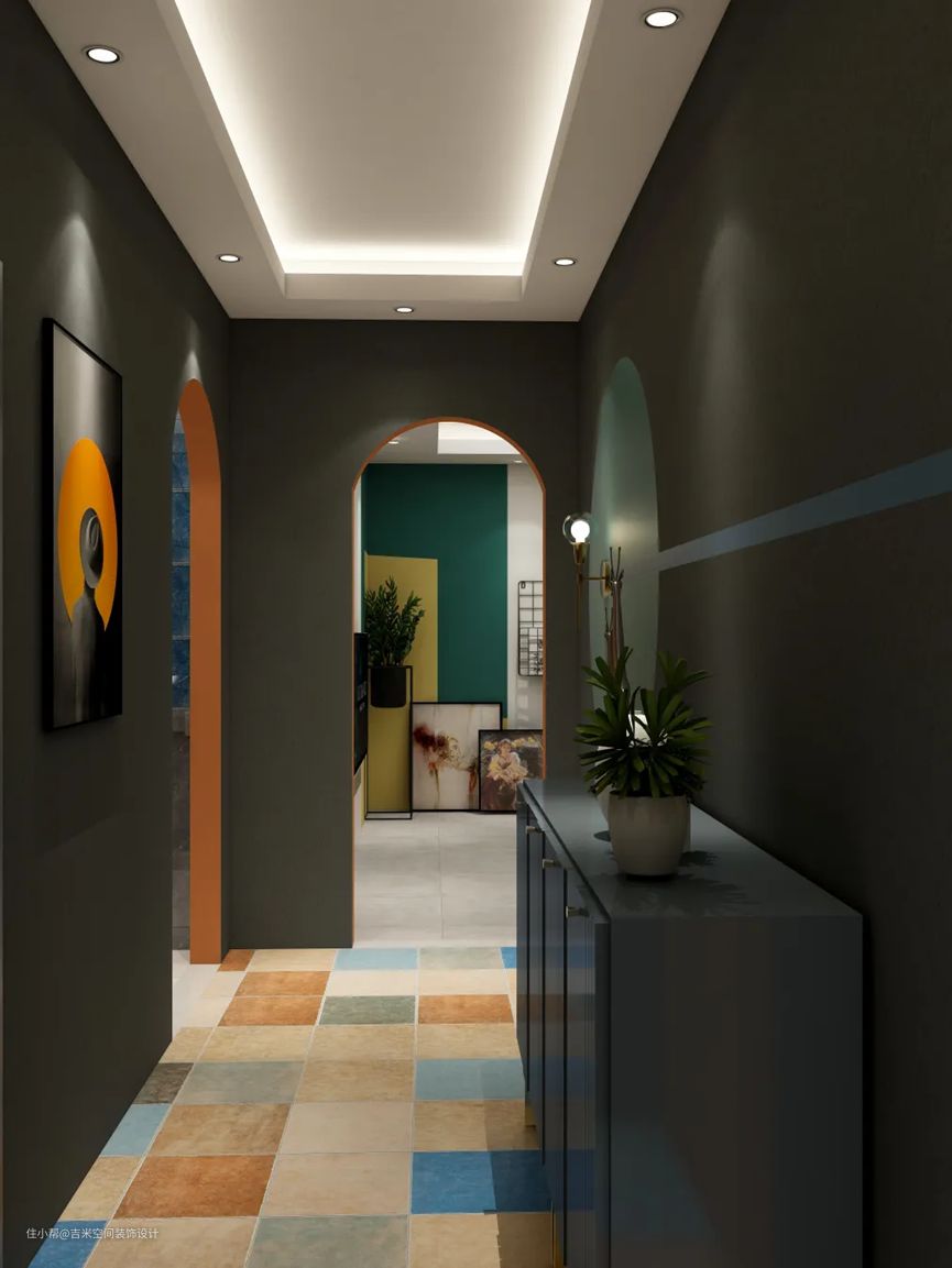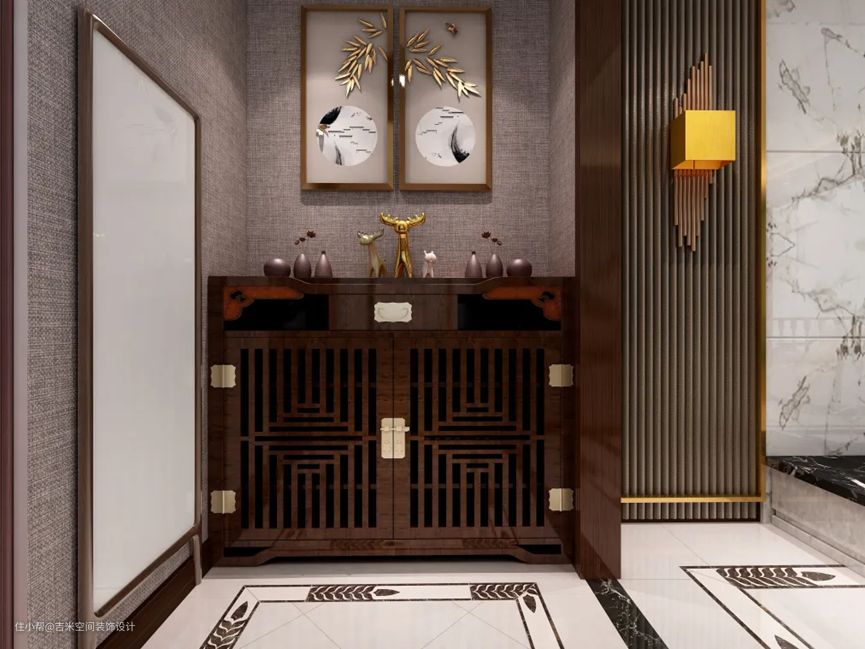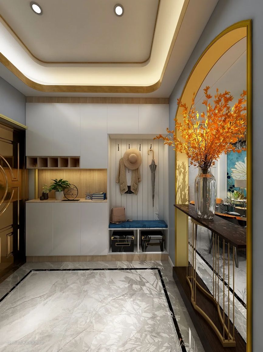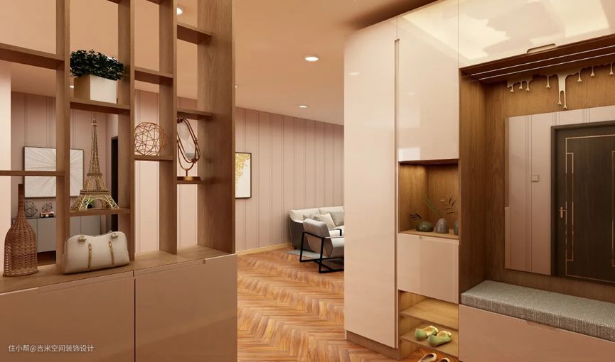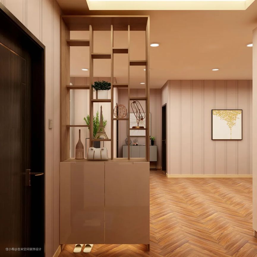 有的业主比较注重隐私这方面,但是户型面积不太理想,却不想要一开门就正对客厅餐厅,觉得隐私没有了保证,那么可以设计一个镂空的柜子作为隔断,增加了设计感,给人高端大气的氛围,镂空的设计非常典雅别致,提升整体家具质感和生活幸福感,同时若隐若现的餐厅客厅衬托出生活美好的小确幸。