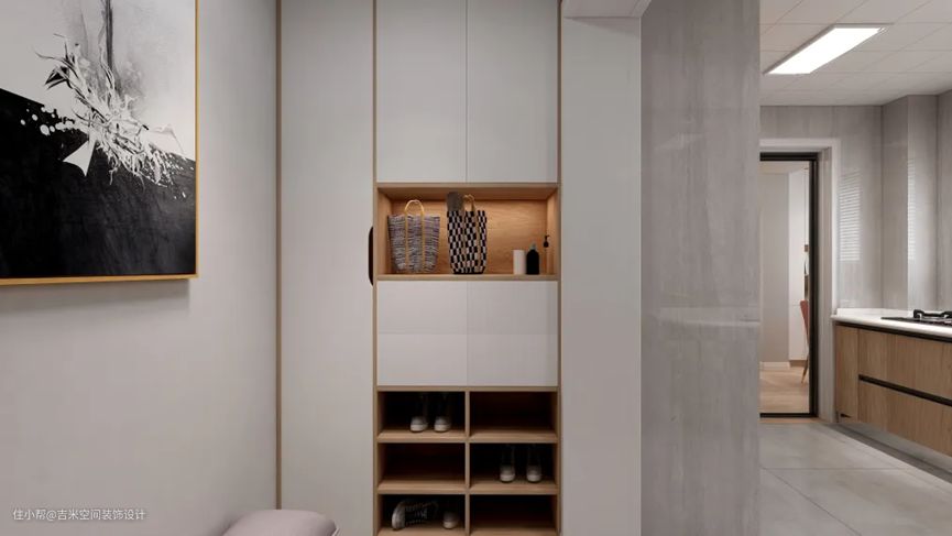 此外,面积不够的用户可以选择将鞋柜和衣柜等其他柜子做成一体式,既弥补了没有玄关的遗憾,又提供了充足的置物收纳空间,这种组合柜比之前的镂空式设计保密性更好,可以遮盖得严严实实的,完全看不到餐厅客厅,保证足够的隐私,体面大方,一体的玄关组合柜带有衣架钩,方便省心。
