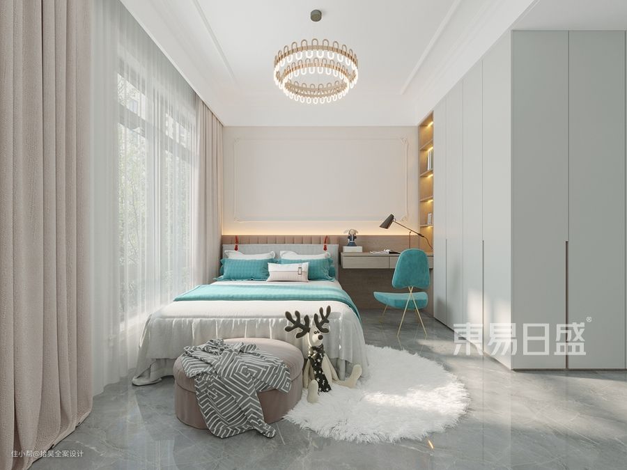 一般来说,相似的配色方案——颜色轮上相邻的颜色,如蓝色和绿色搭配可以使人更随意、更放松,并且在非正式或私人空间中的效果最佳,卧室是我们劳累了一整天休息的避风港,它是让人休息、恢复精力的好地方,蓝绿搭配可以使人舒适,有助于消除神经紧张和视觉疲劳,用在卧室是一个非常好的策略。