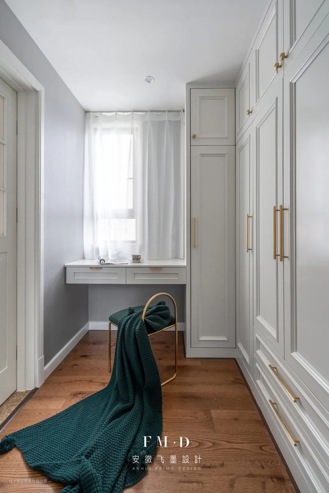 如果有衣帽间,衣帽间也是梳妆台的好归属,毕竟更衣梳妆动线最短。在衣帽间内,梳妆台要跟着衣帽间的布局走: